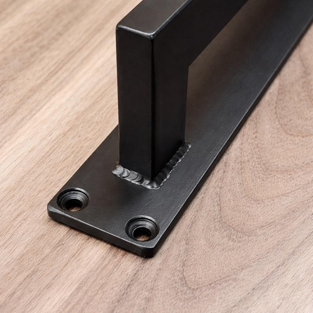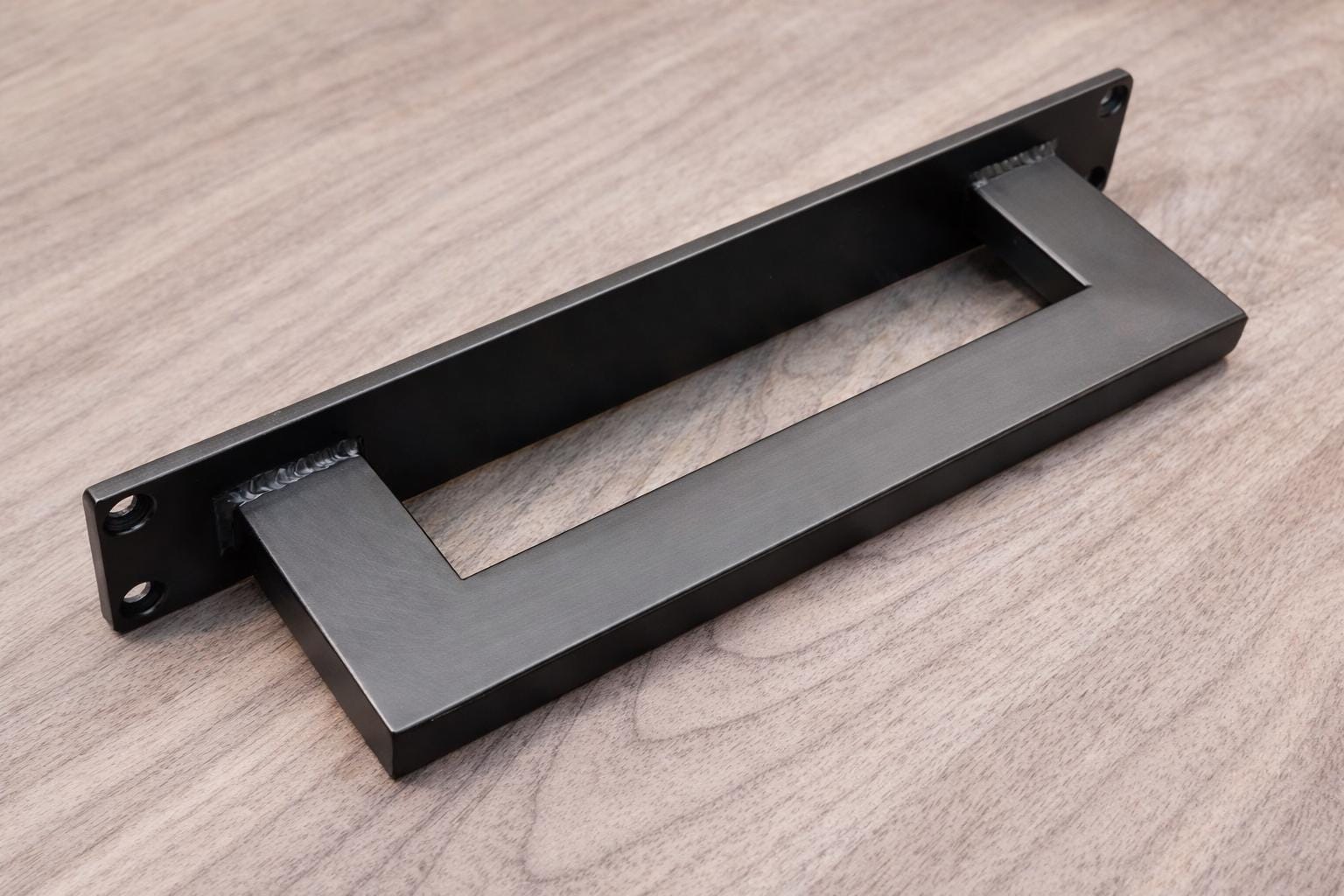 This door handle is made of 1/2" x 1" rectangle steel tube and will stand up to any punishment you could throw at it. The welds are ground clean and smoothed. Once it's finished, the whole piece gets a coat of clear to bring out the natural beauty of the steel. Another option is to paint the handle flat black for a refined, matte finish.