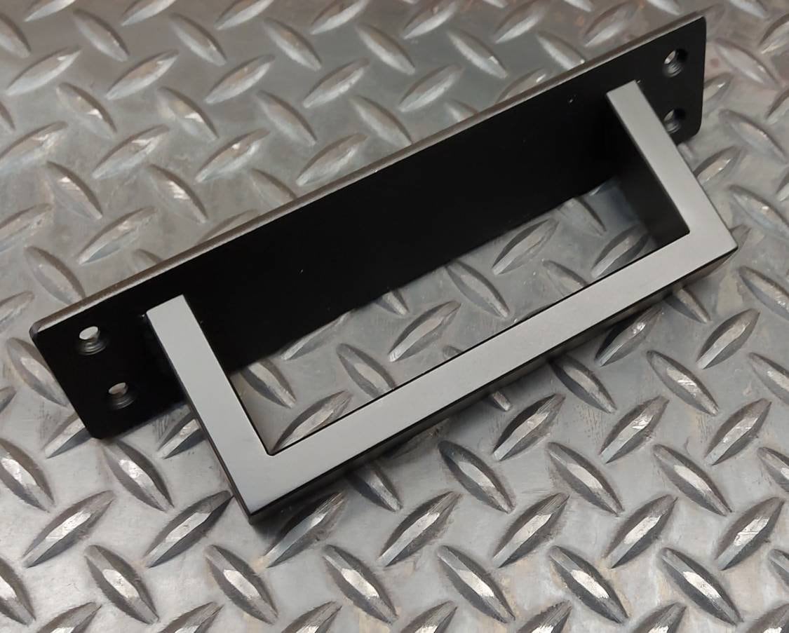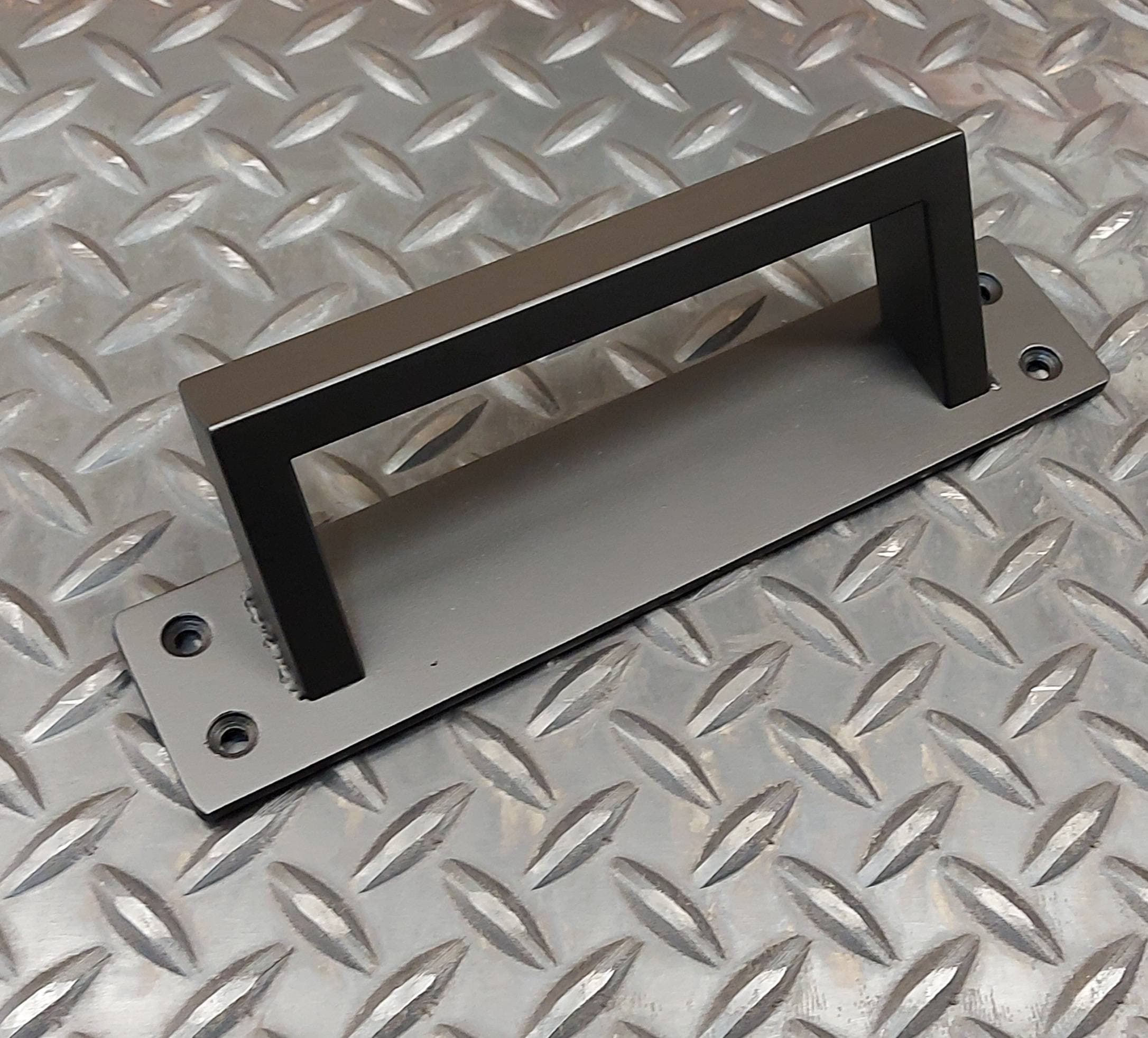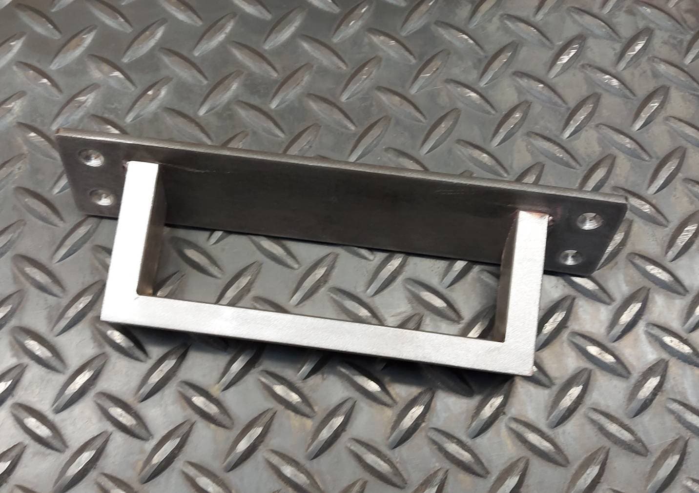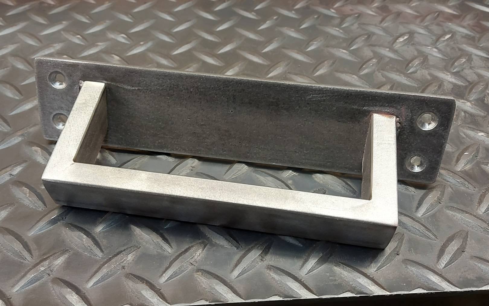 This handle is made of 3/16" thick hot-rolled flat stock and 1" x 1/2" cold-rolled rectangle tube. It is fully TIG welded, and once cooled off the whole piece gets a coat of clear to bring out the natural beauty of the mill-scale steel. Excellent for commercial/exterior use.