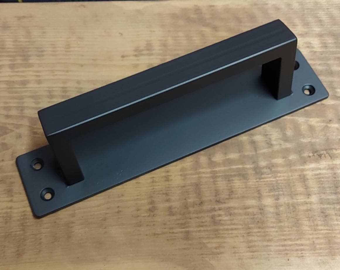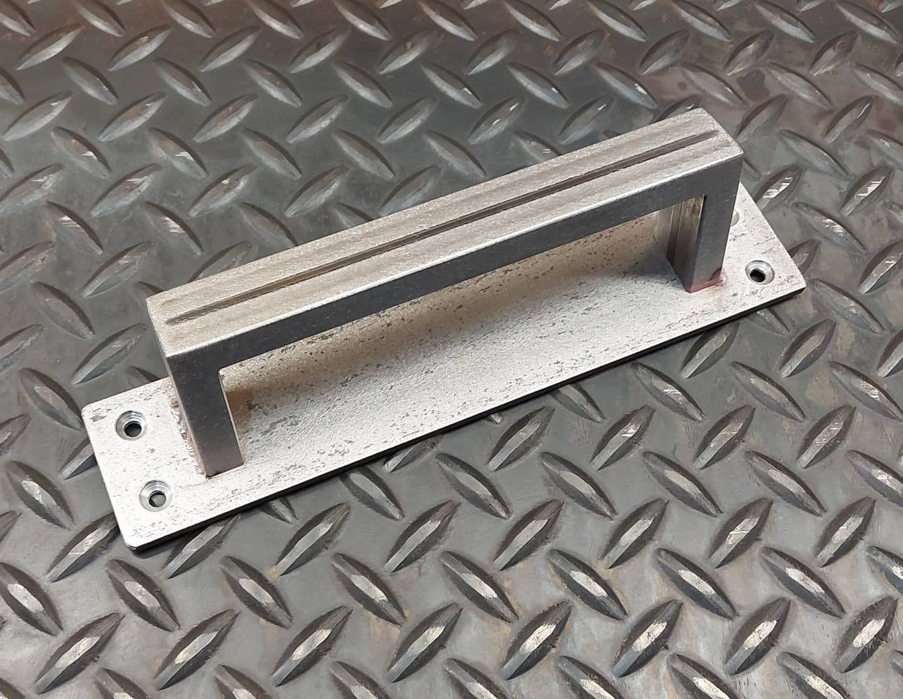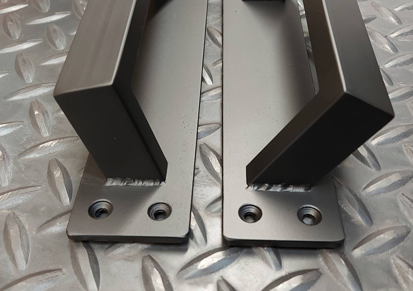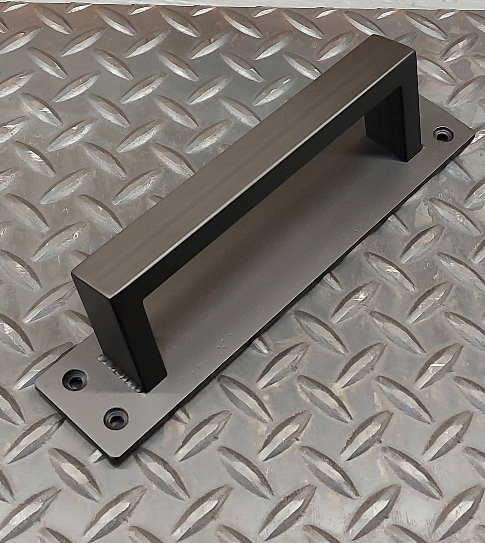 This handle is made of 3/16" thick hot-rolled flat stock and 1" x 1/2" cold-rolled rectangle tube. It is fully TIG welded, and once cooled off the whole piece gets a coat of clear to bring out the natural beauty of the mill-scale steel. Excellent for commercial/exterior use.