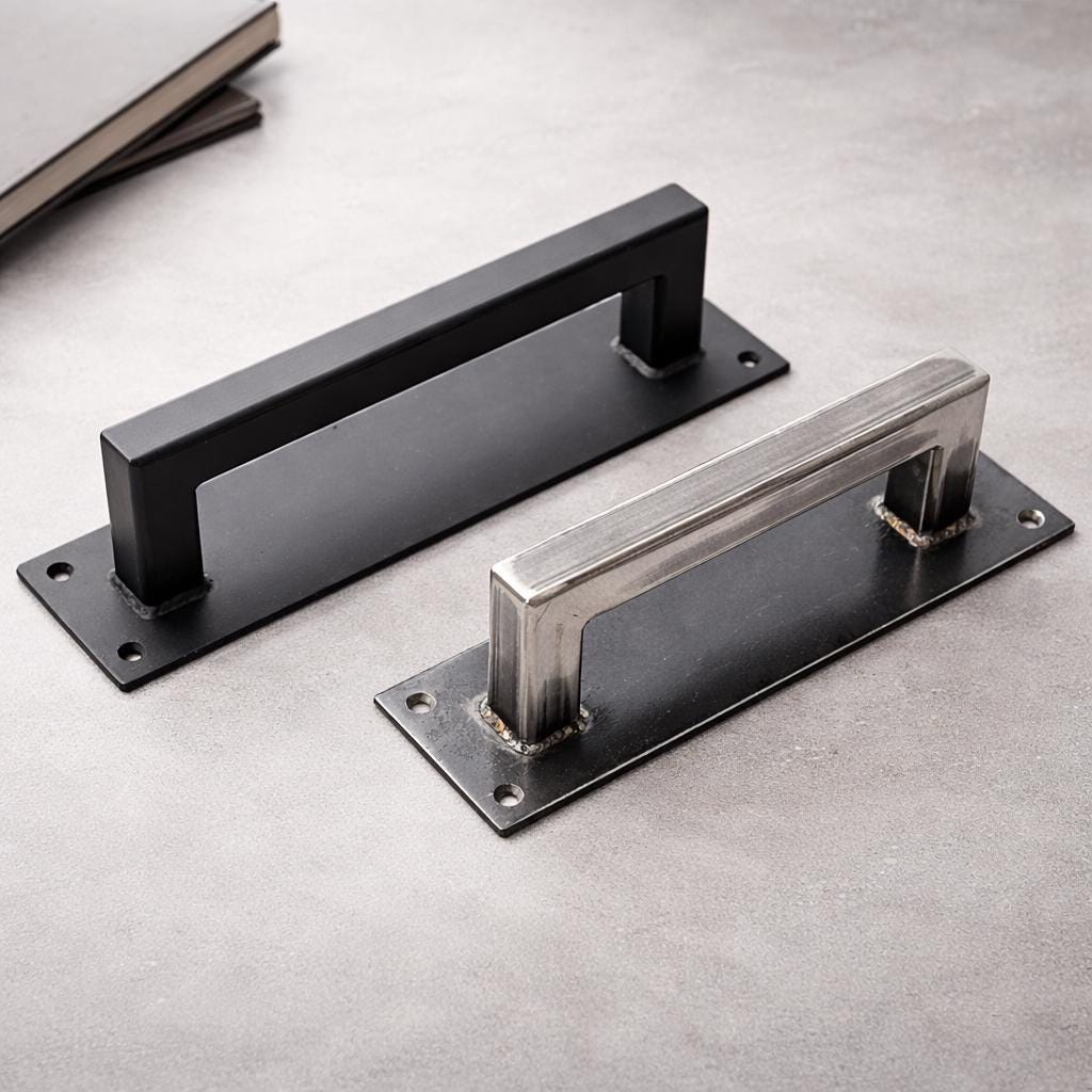 The proportions are simple and deliberate: a clean rectangular pull with enough mass to feel permanent in the hand, without excess. Welds are fully ground and smoothed, leaving a quiet, refined surface that lets the material speak.
