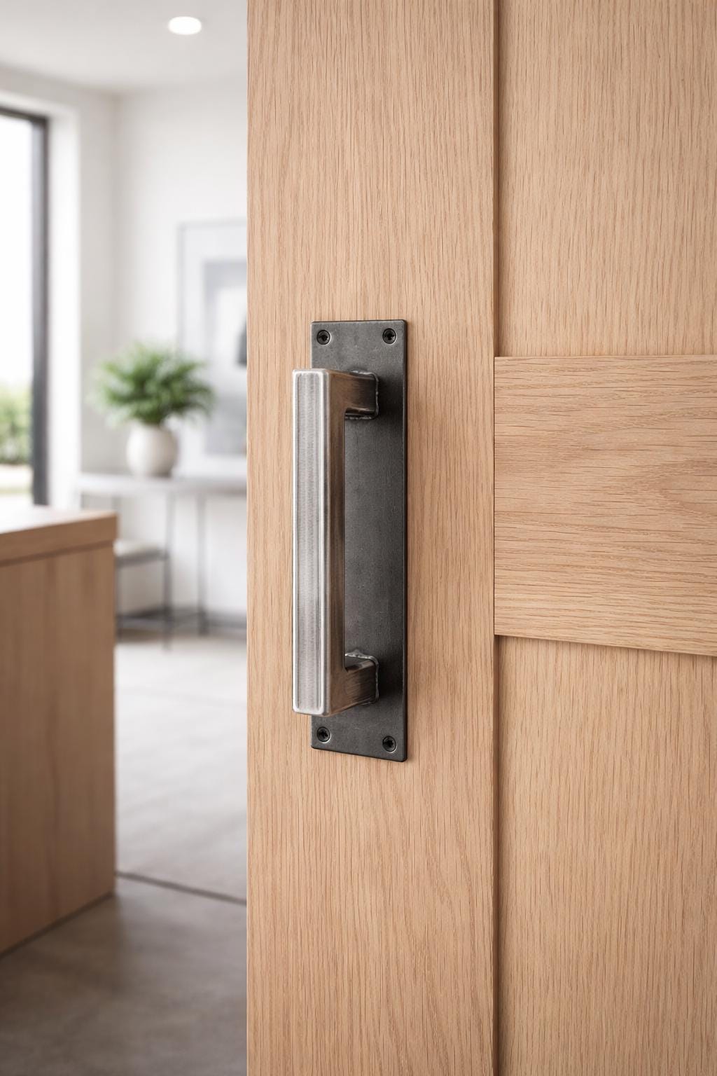 This handle is fabricated from 1" structural-grade square steel tube mounted to a thick, 3" wide backing plate, giving it a grounded, architectural presence that reads as intentional in both residential and commercial settings.
