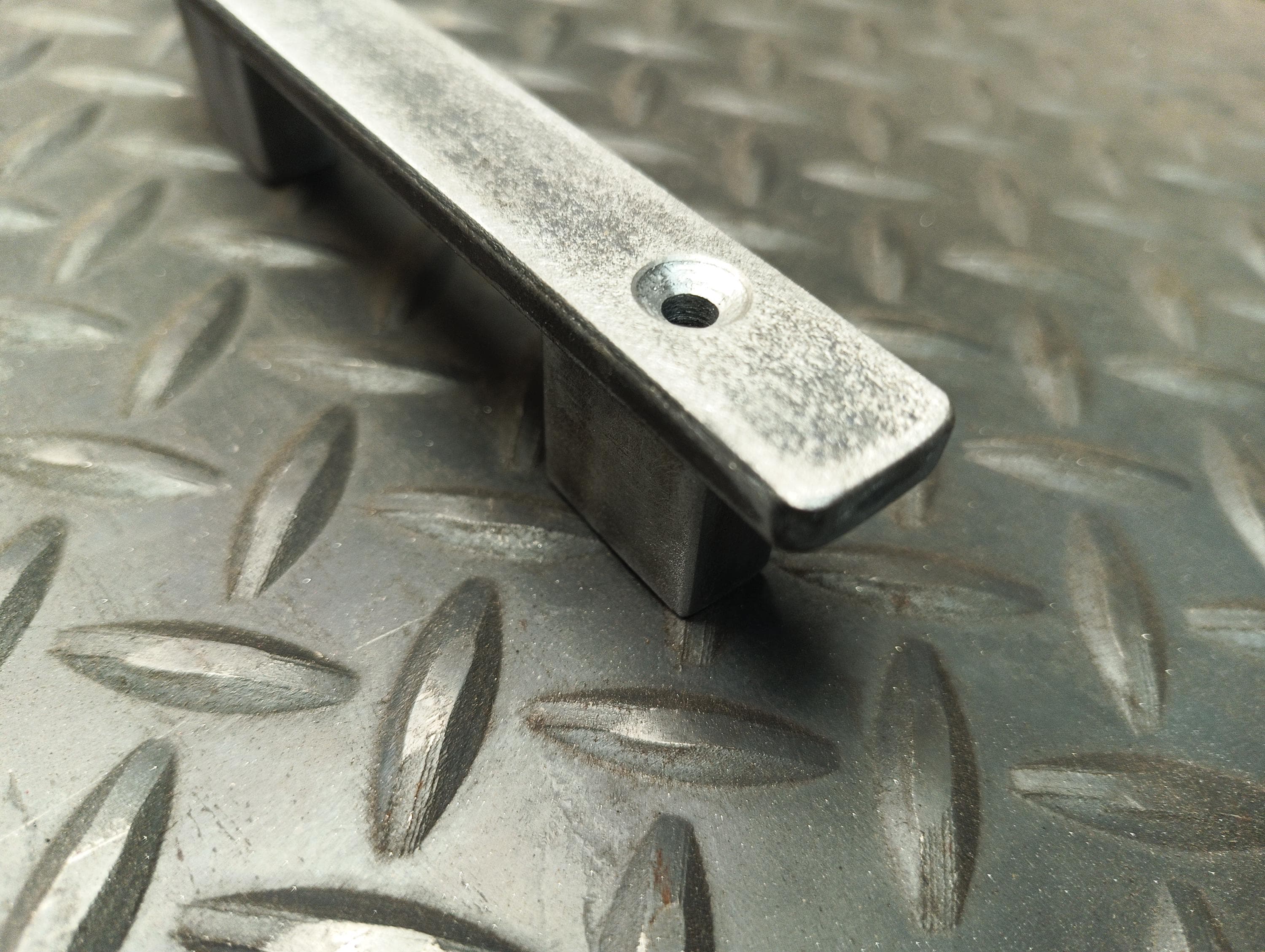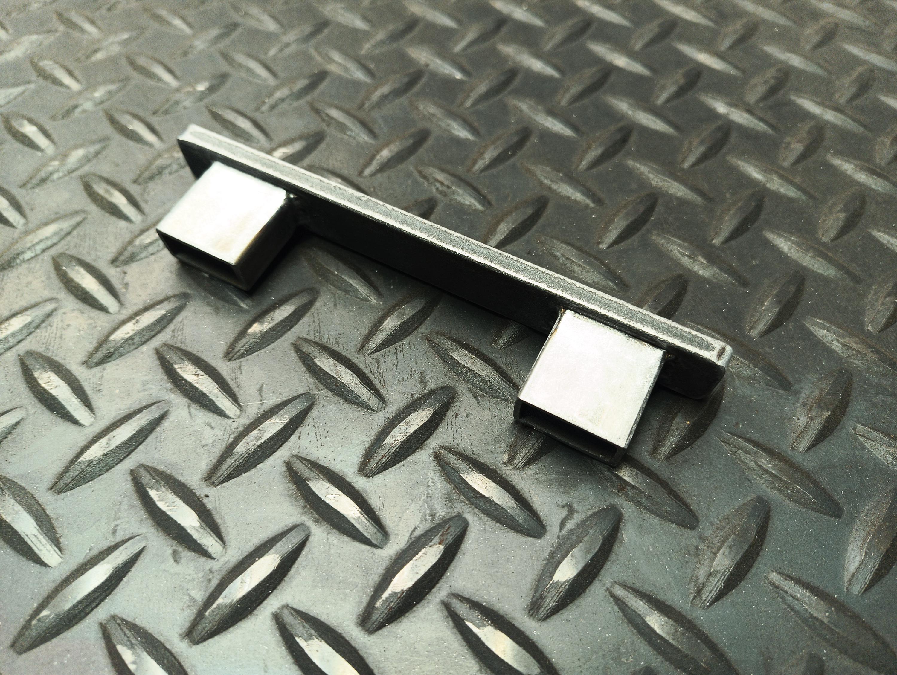 Low profile industrial barn door handle - measures 3/4" wide, 1-1/4" thick door/cabinet pull, available in multiple sizes - pictured is a 6" handle, raw steel no coating.