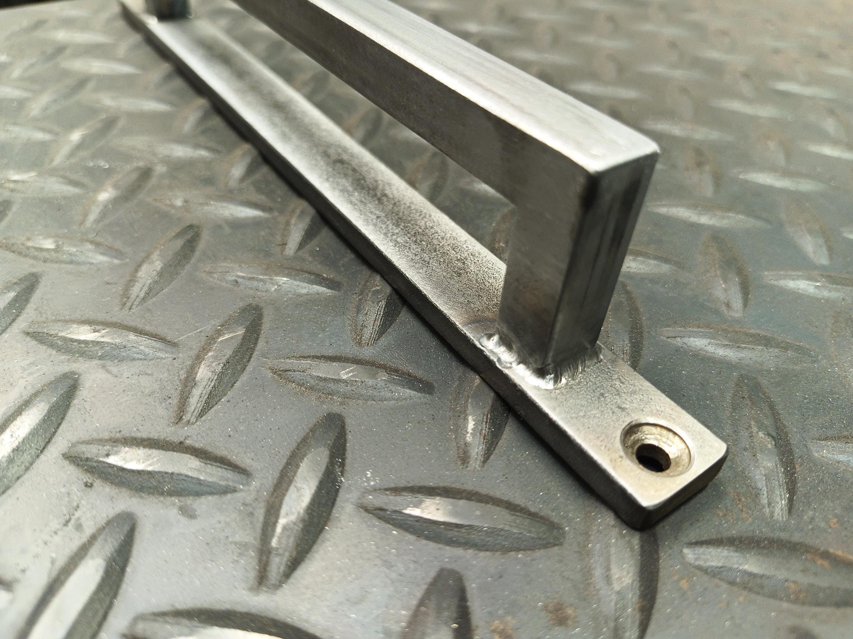 This door handle is made of 1/2" square steel tube and will stand up to any punishment you could throw at it. The welds are ground clean and smoothed. Once it's finished, the whole piece gets a coat of clear to bring out the natural beauty of the steel. Another option is to paint the handle flat black for a refined, matte finish.