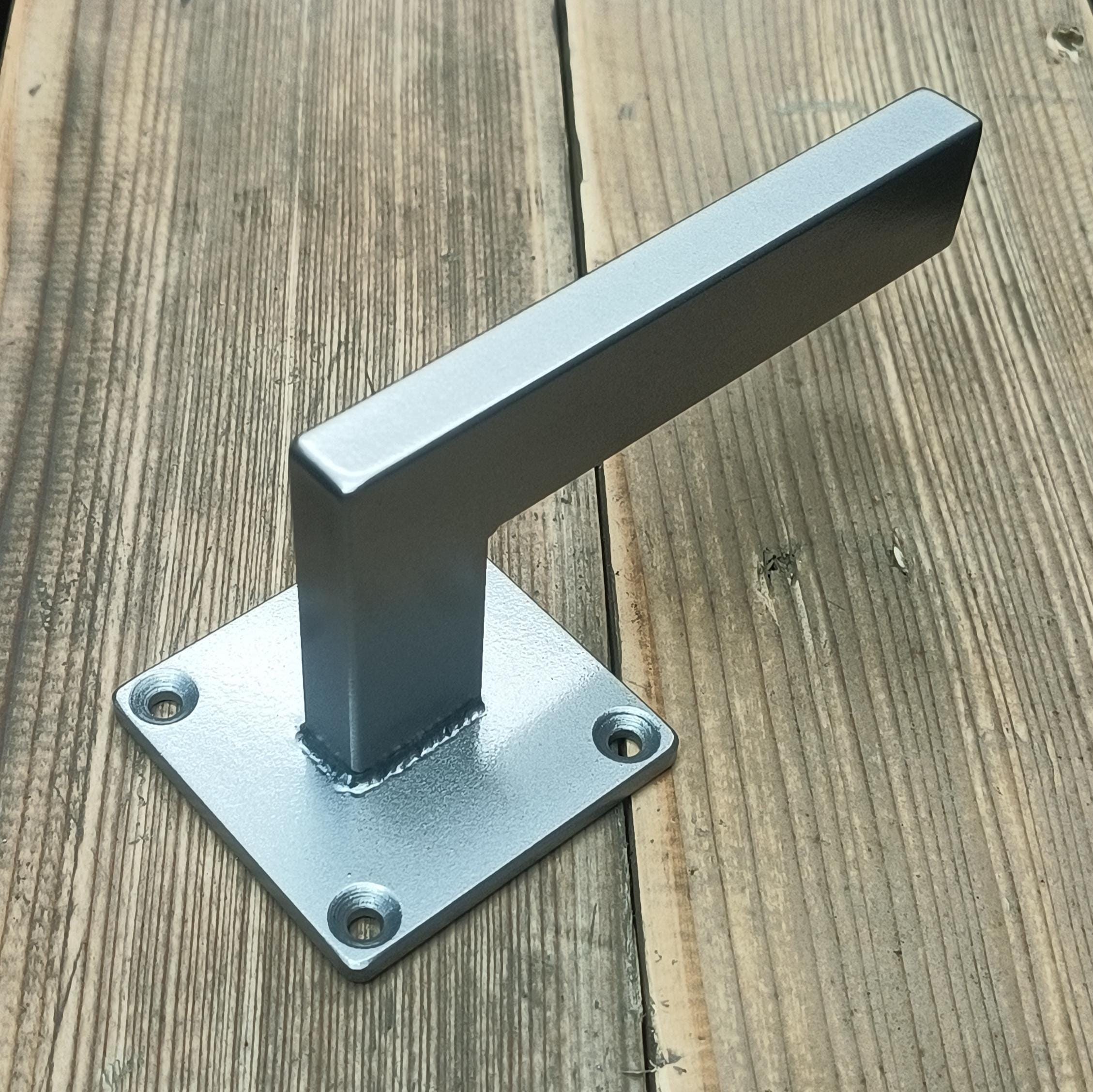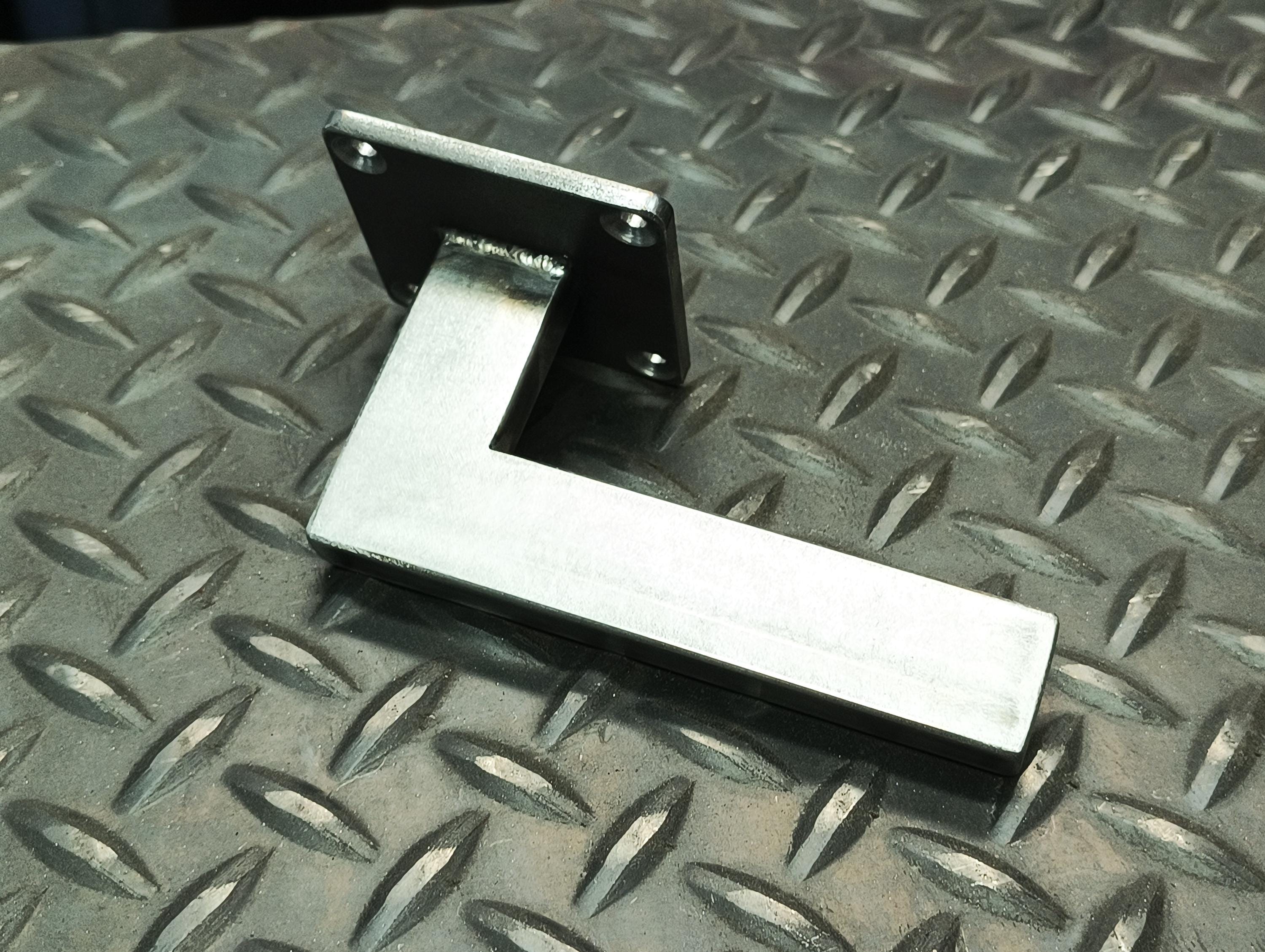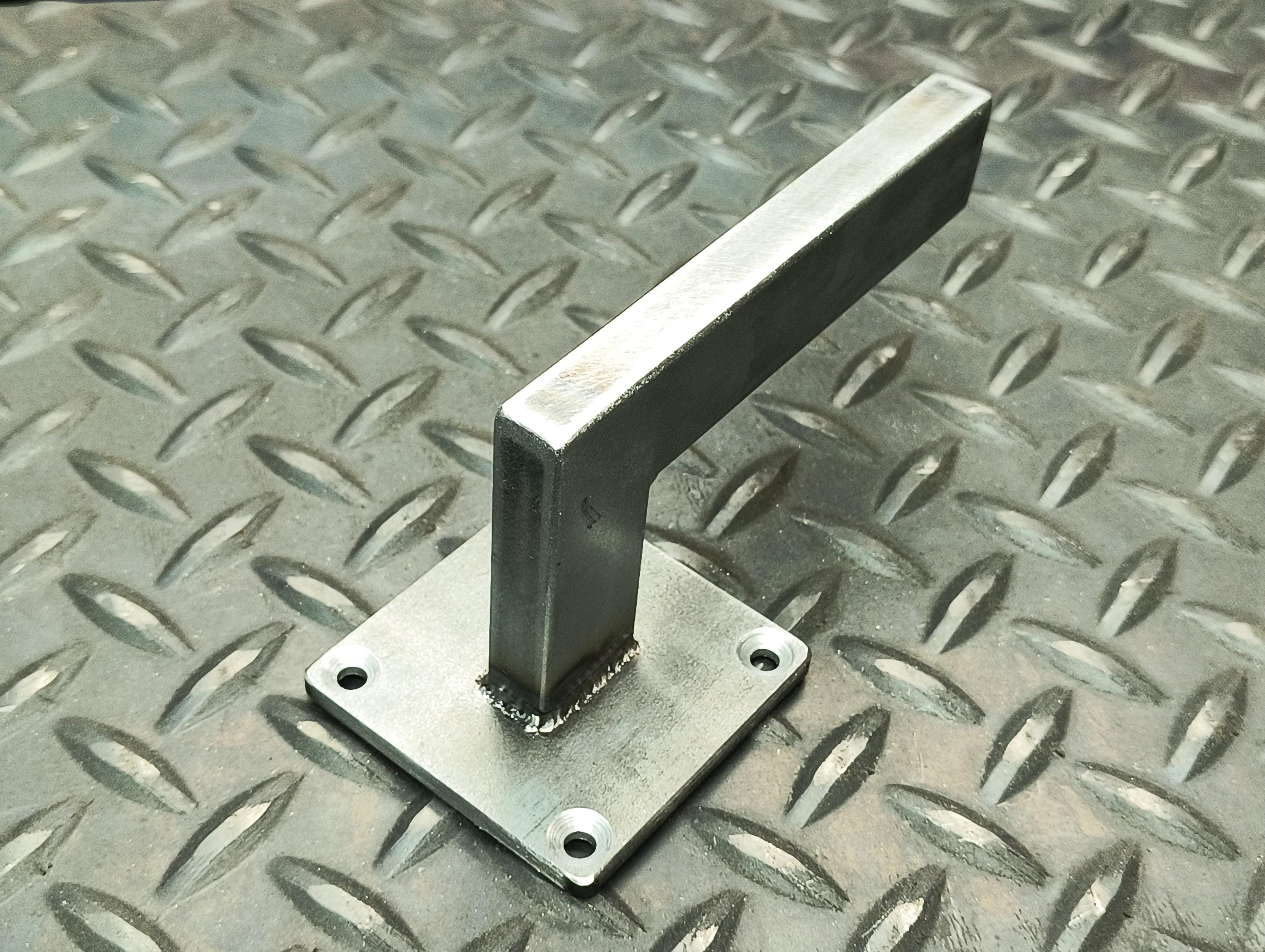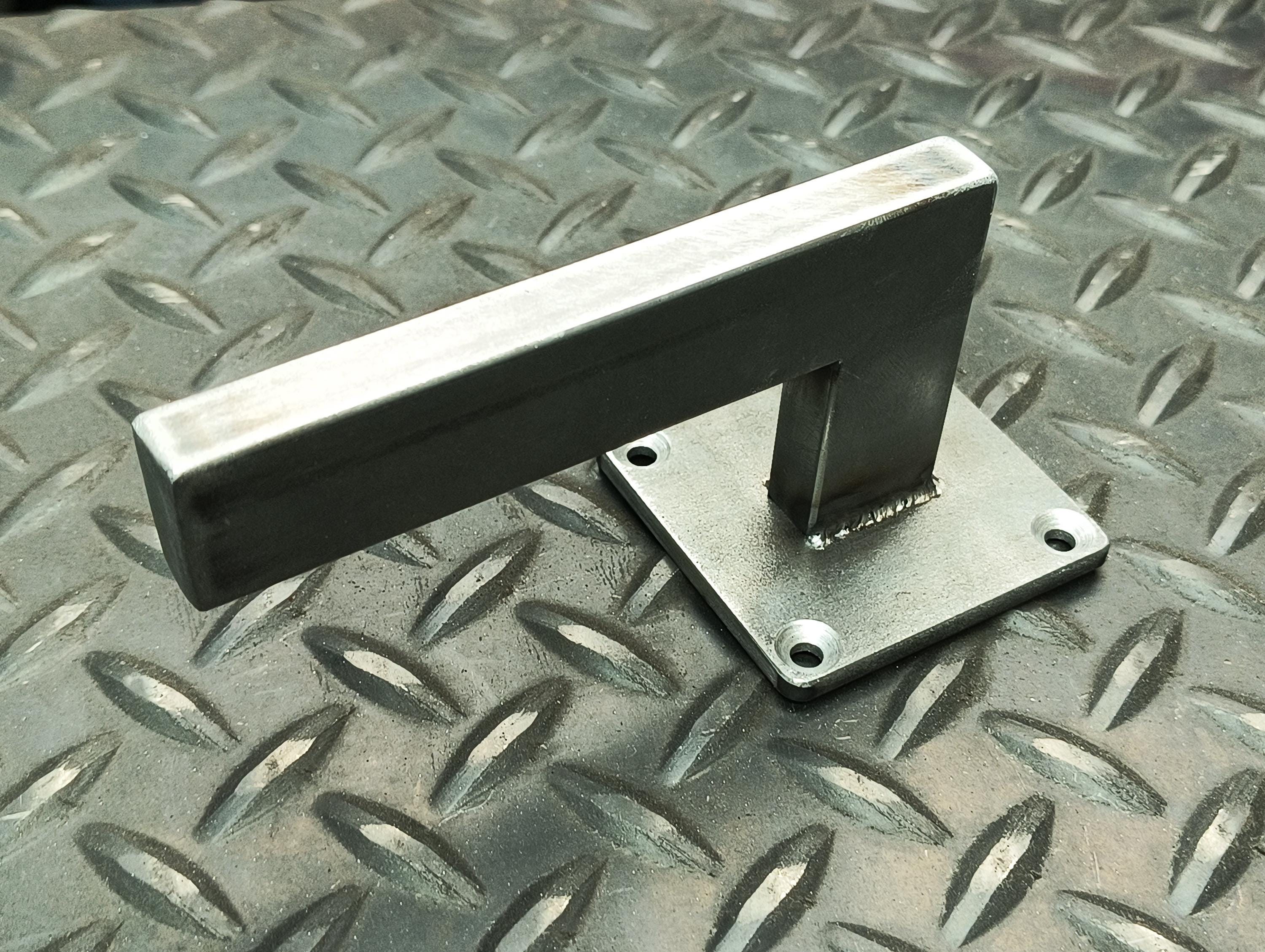 Made of hot rolled steel - 2-1/2" x 3/16" backing plate, 1" x 1/2" rectangle tubing posts, capped, welded and blended.