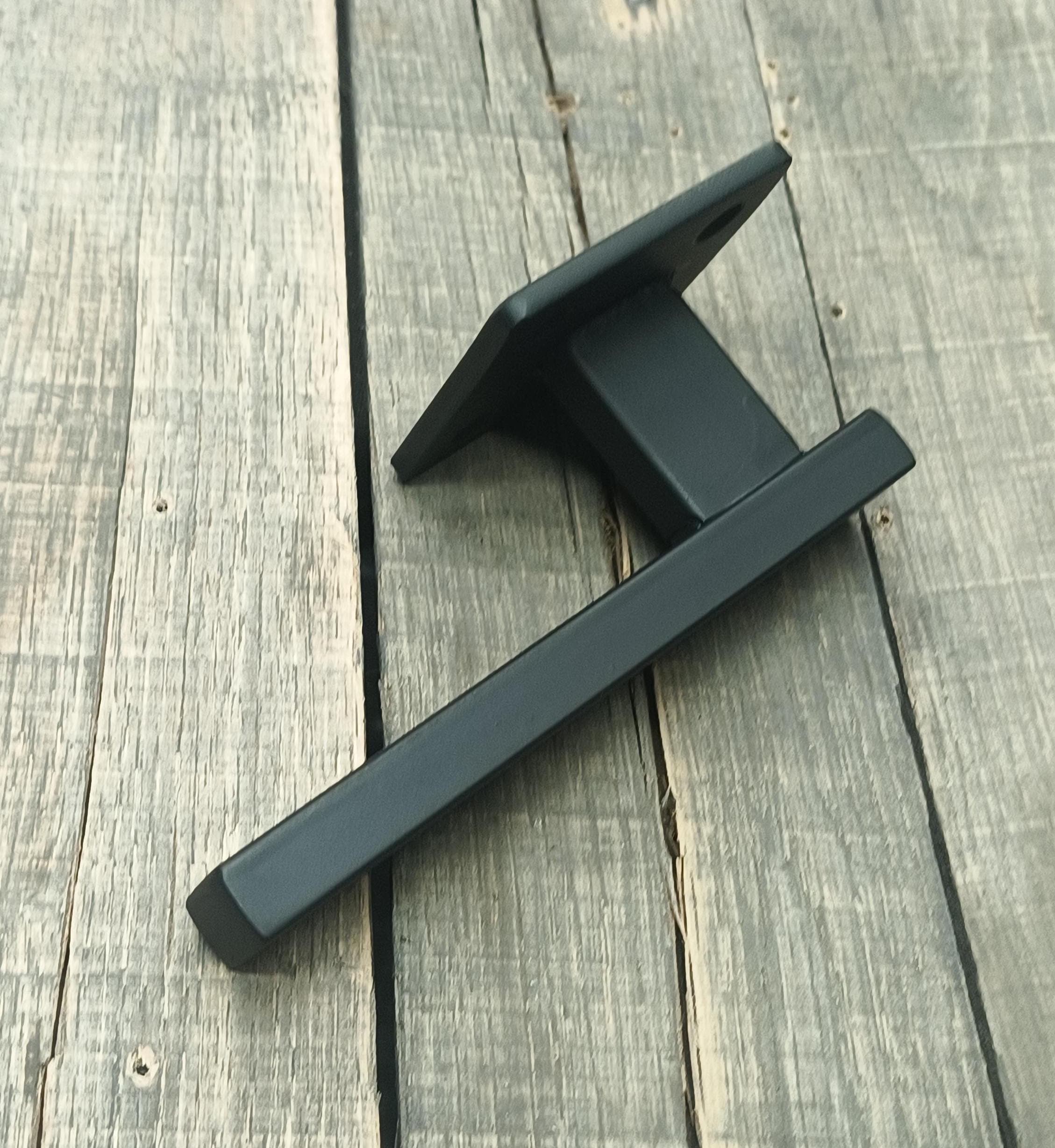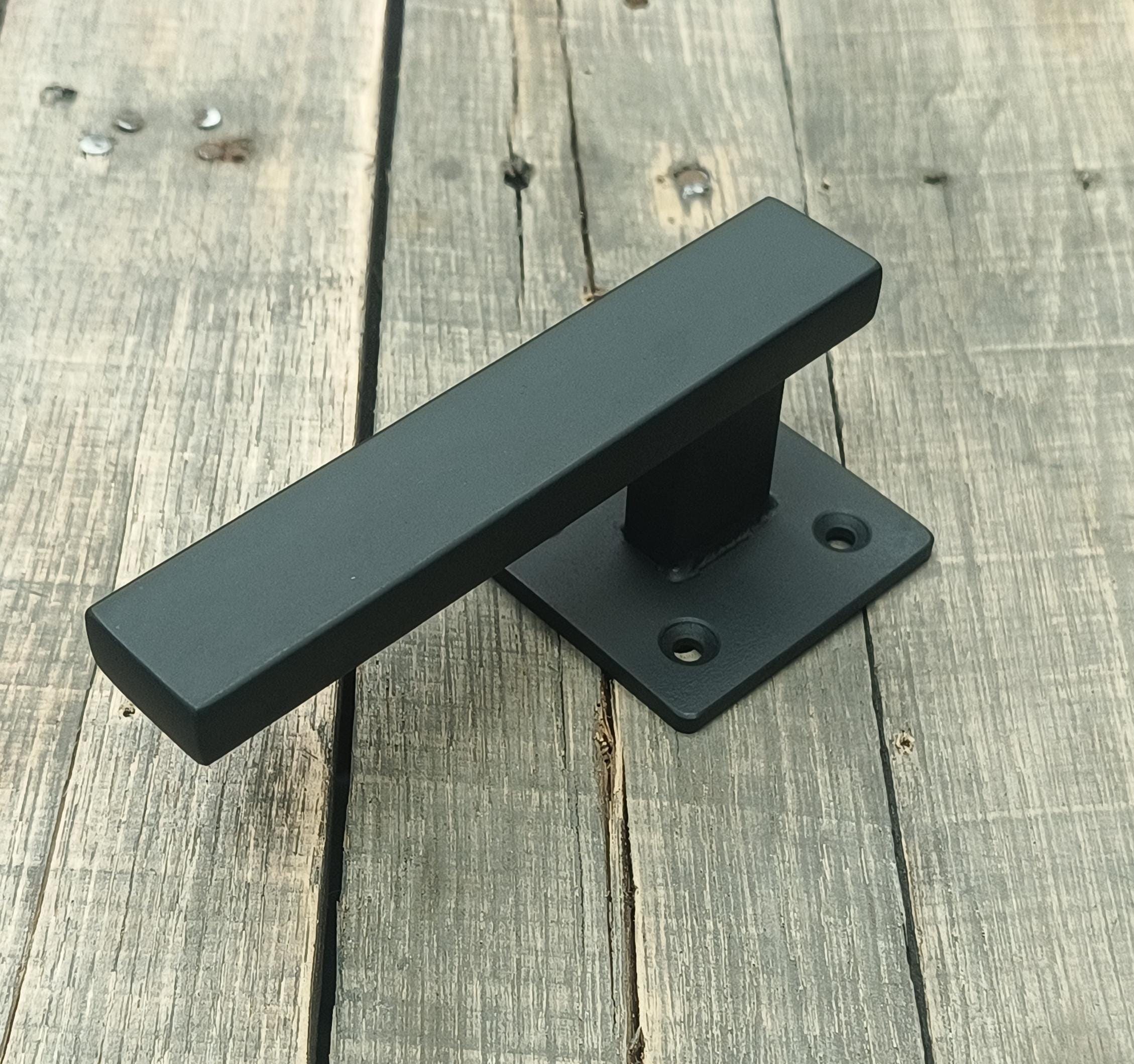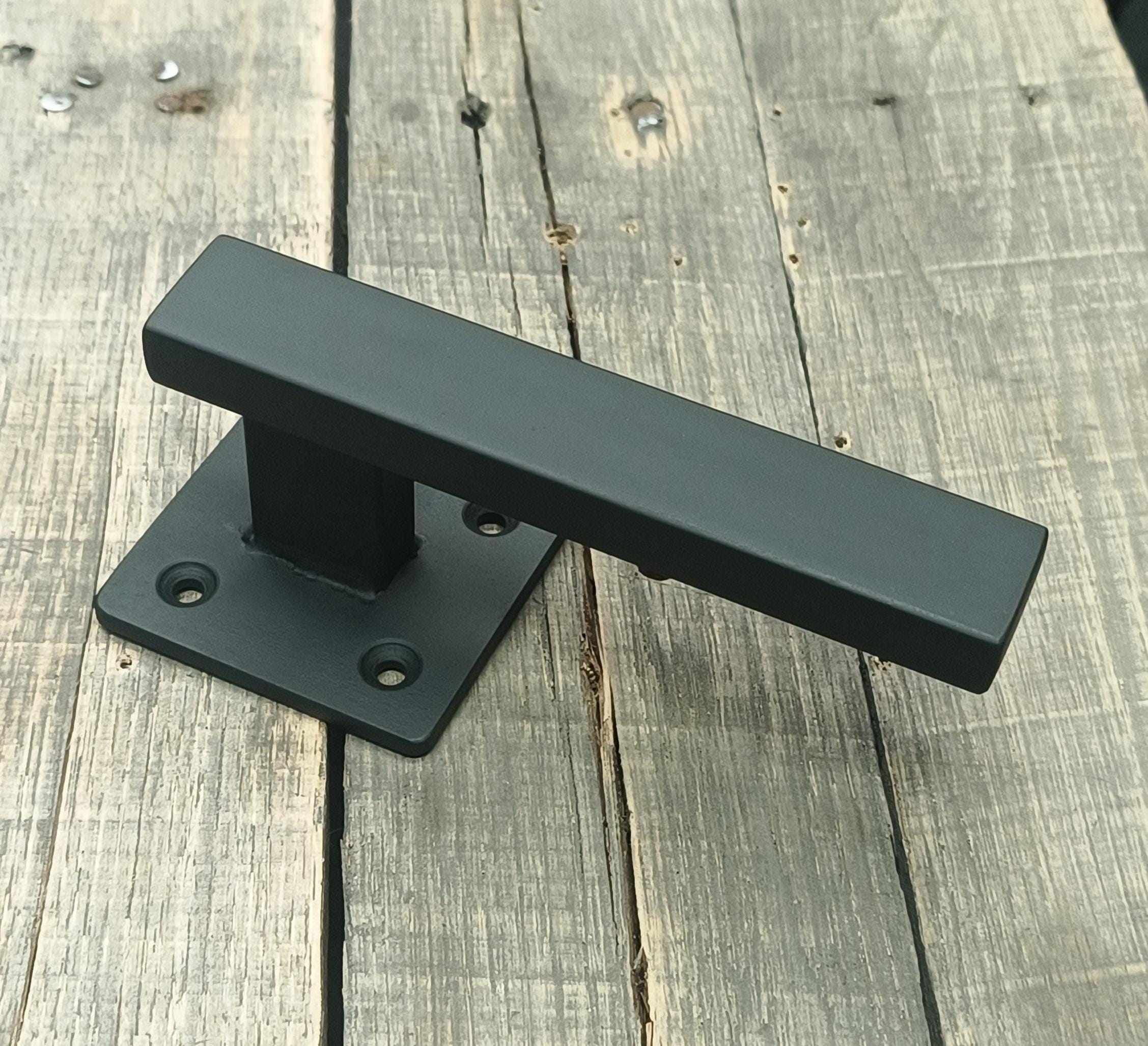 Made of hot rolled steel - 2-1/2" x 3/16" backing plate, 1" x 1/2" rectangle tubing posts, capped, welded and blended.