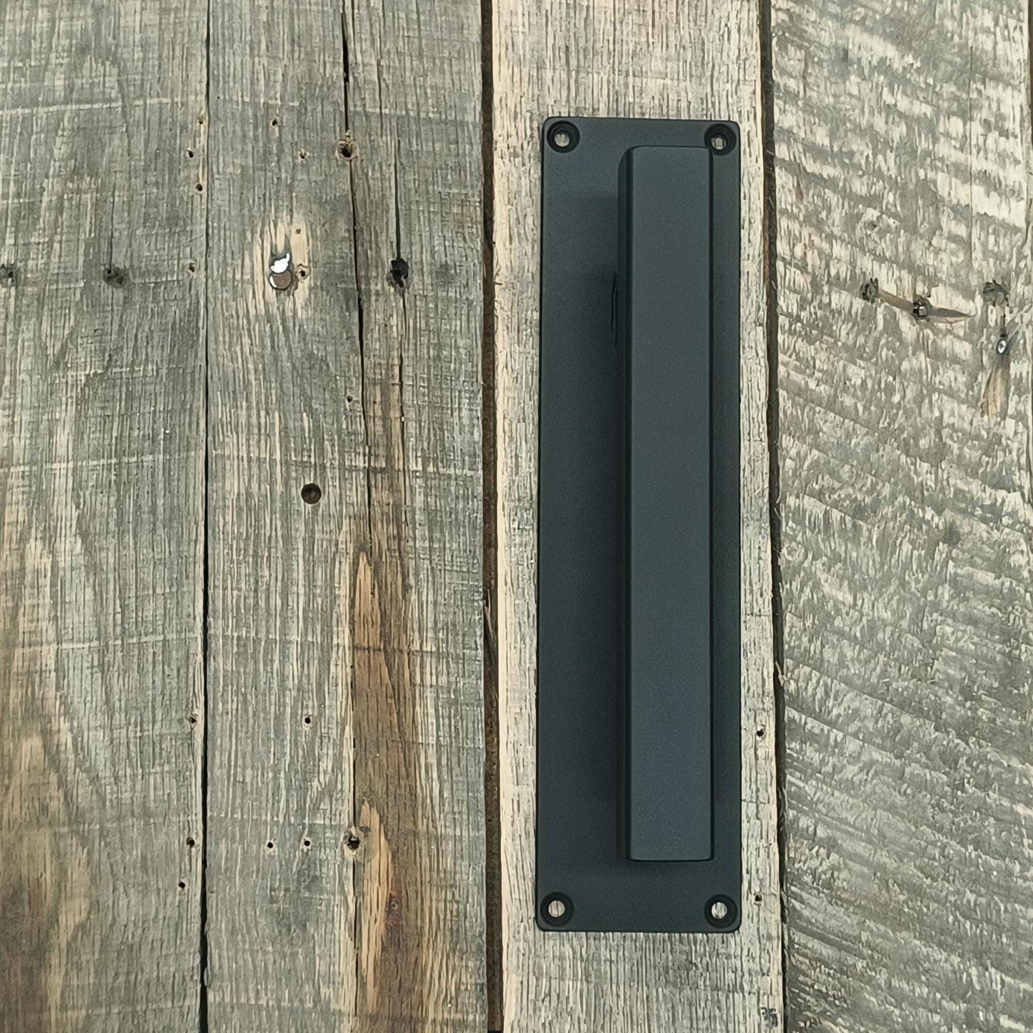 A tough, industrial style pull without the extra bulk of a traditional barn door handle.