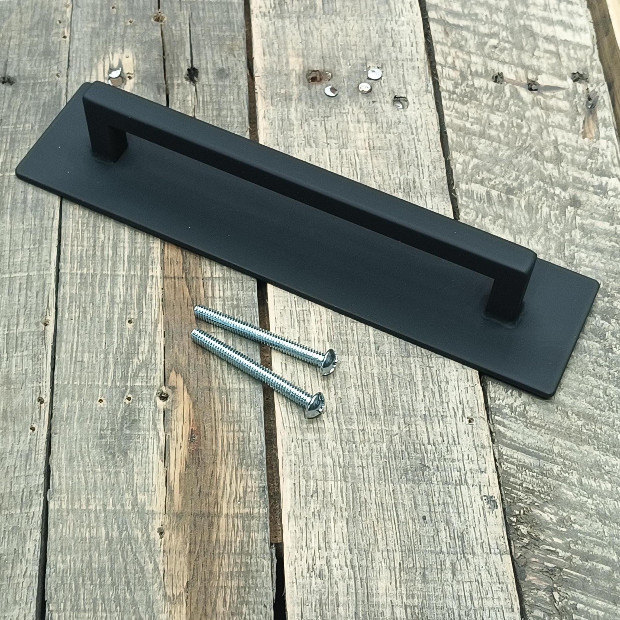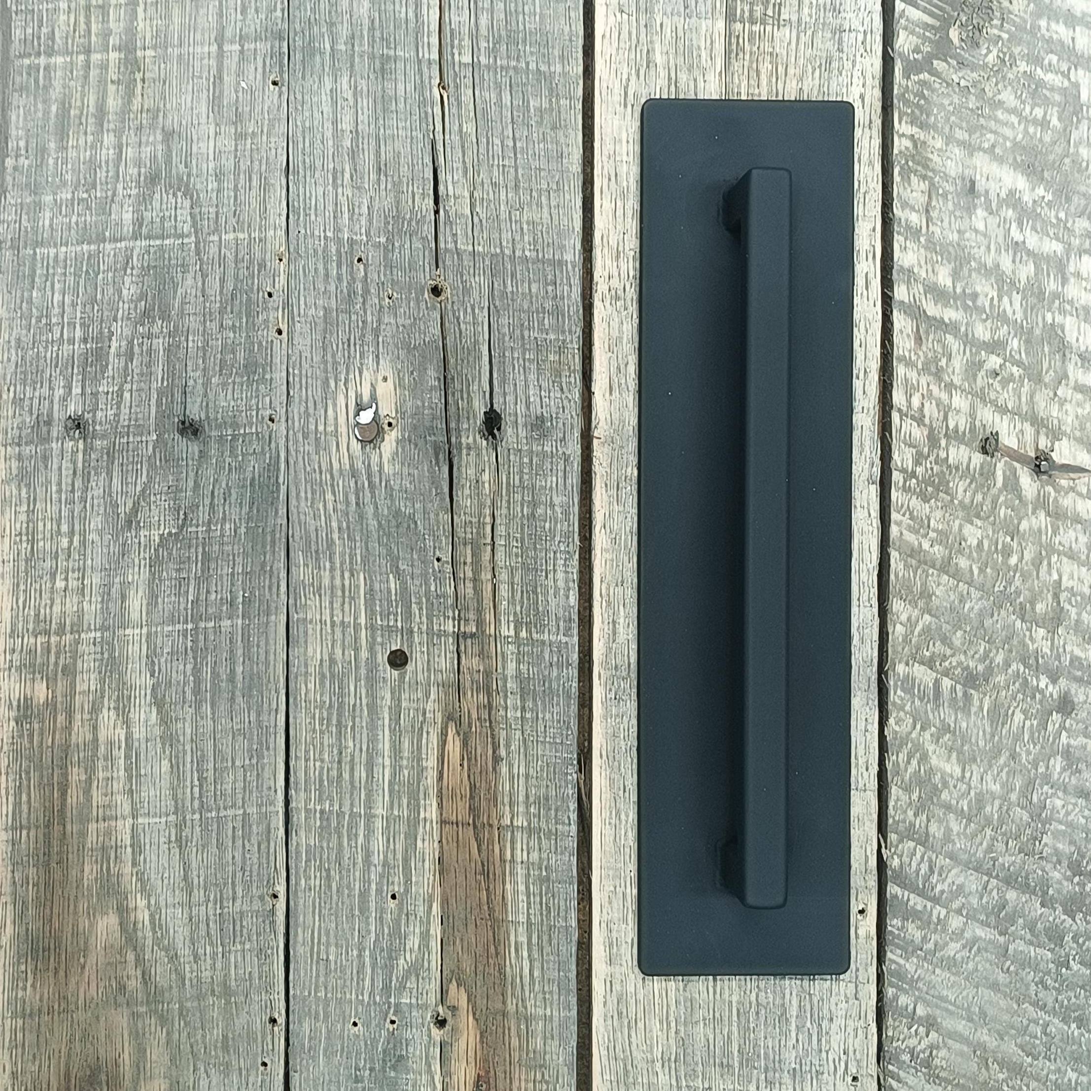 A tough, industrial style pull without the extra bulk of a traditional barn door handle.