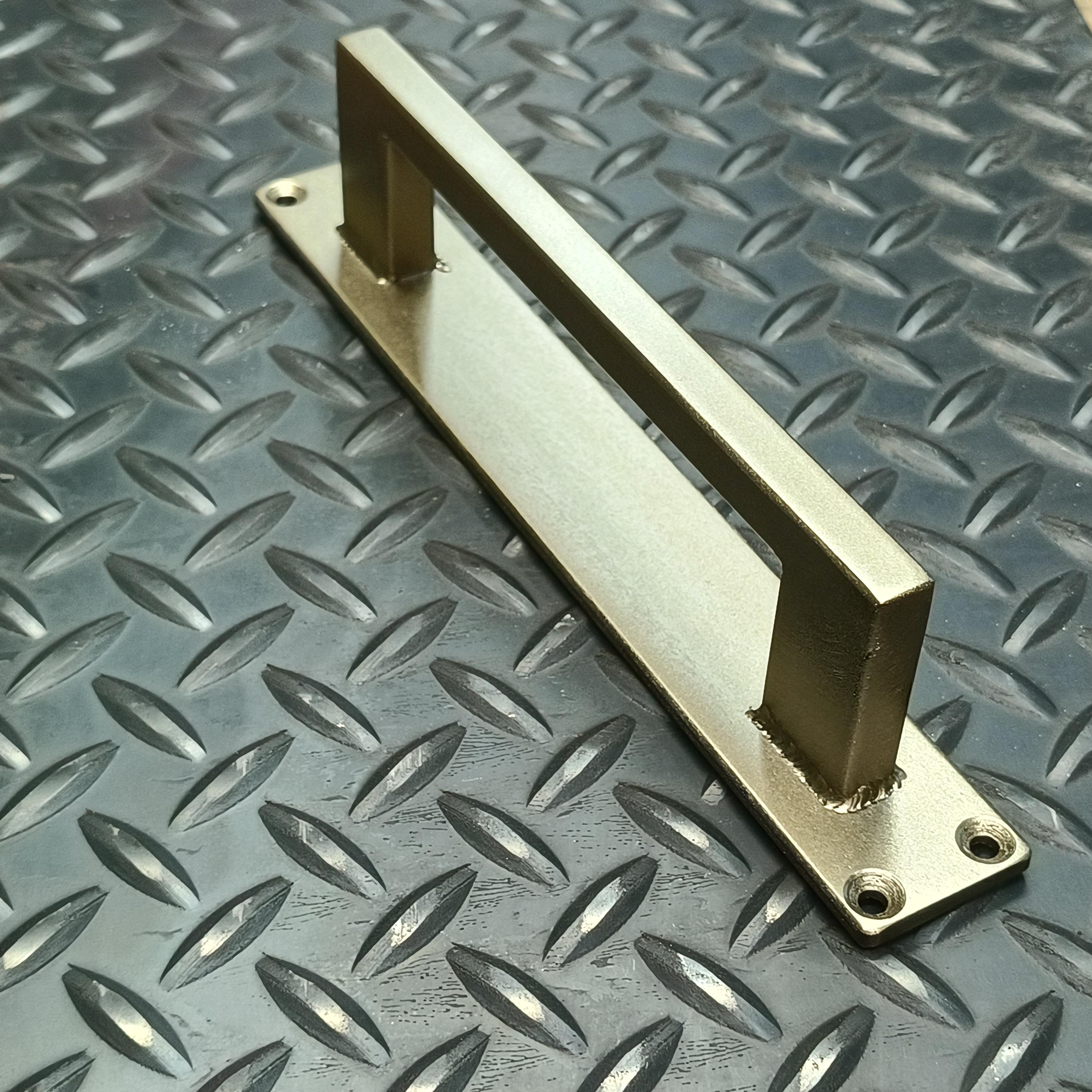 This door handle is made of 1/2" square steel tube and will stand up to any punishment you could throw at it. The welds are ground clean and smoothed. Once it's finished, the whole piece gets a coat of clear to bring out the natural beauty of the steel. Another option is to paint the handle flat black for a refined, matte finish.