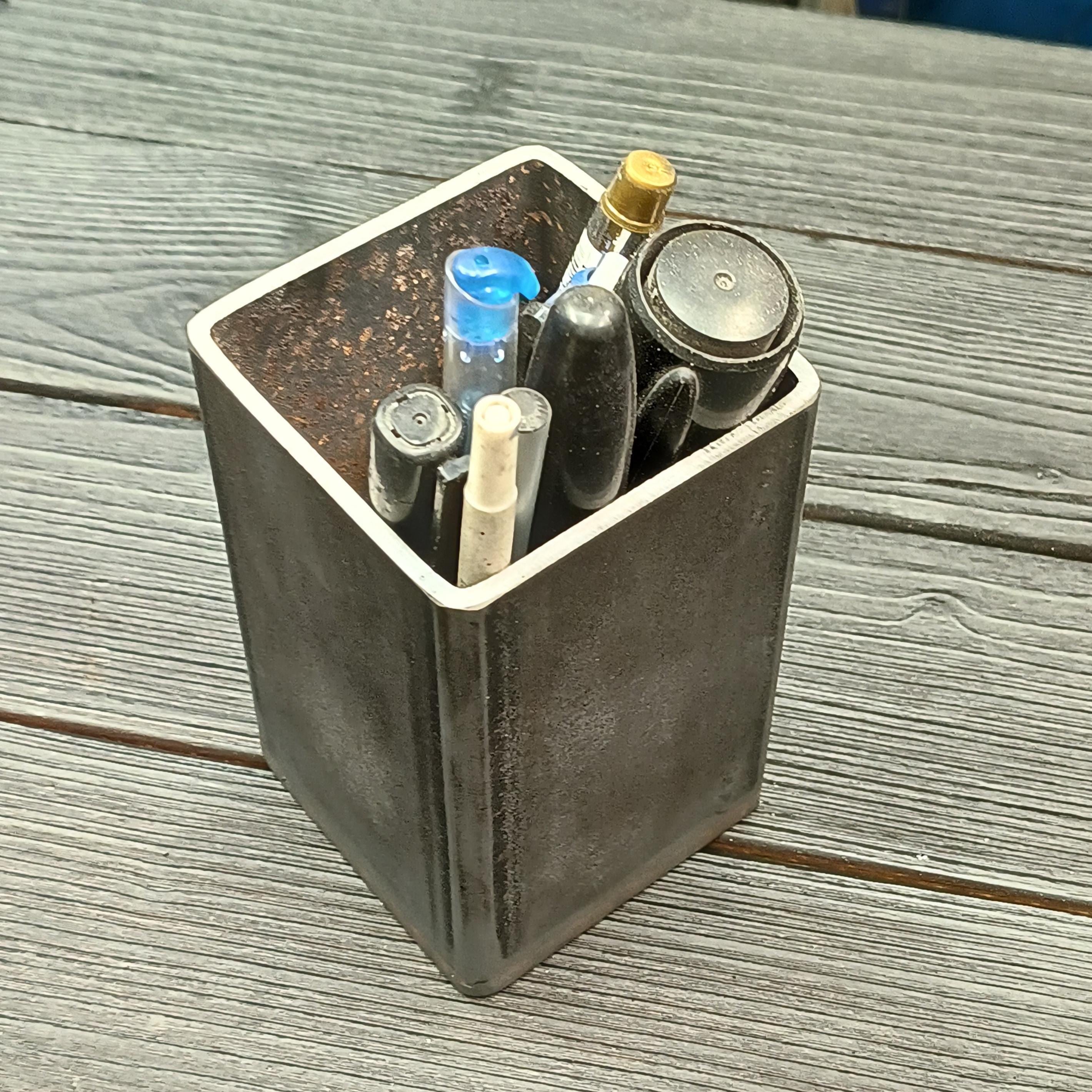 Elevate your workspace with this Industrial 3" Square Pencil Holder, a perfect heavy-duty steel desk organizer designed to bring minimalist chic to any office setting. Crafted from robust structural grade tubing, this pen container measures 4.5 inches tall and 3 inches square, offering ample space to hold your pens, pencils, markers, and small office essentials with style and durability. The welded cap and ground smooth finish ensure a sleek, seamless look that complements modern industrial decor.