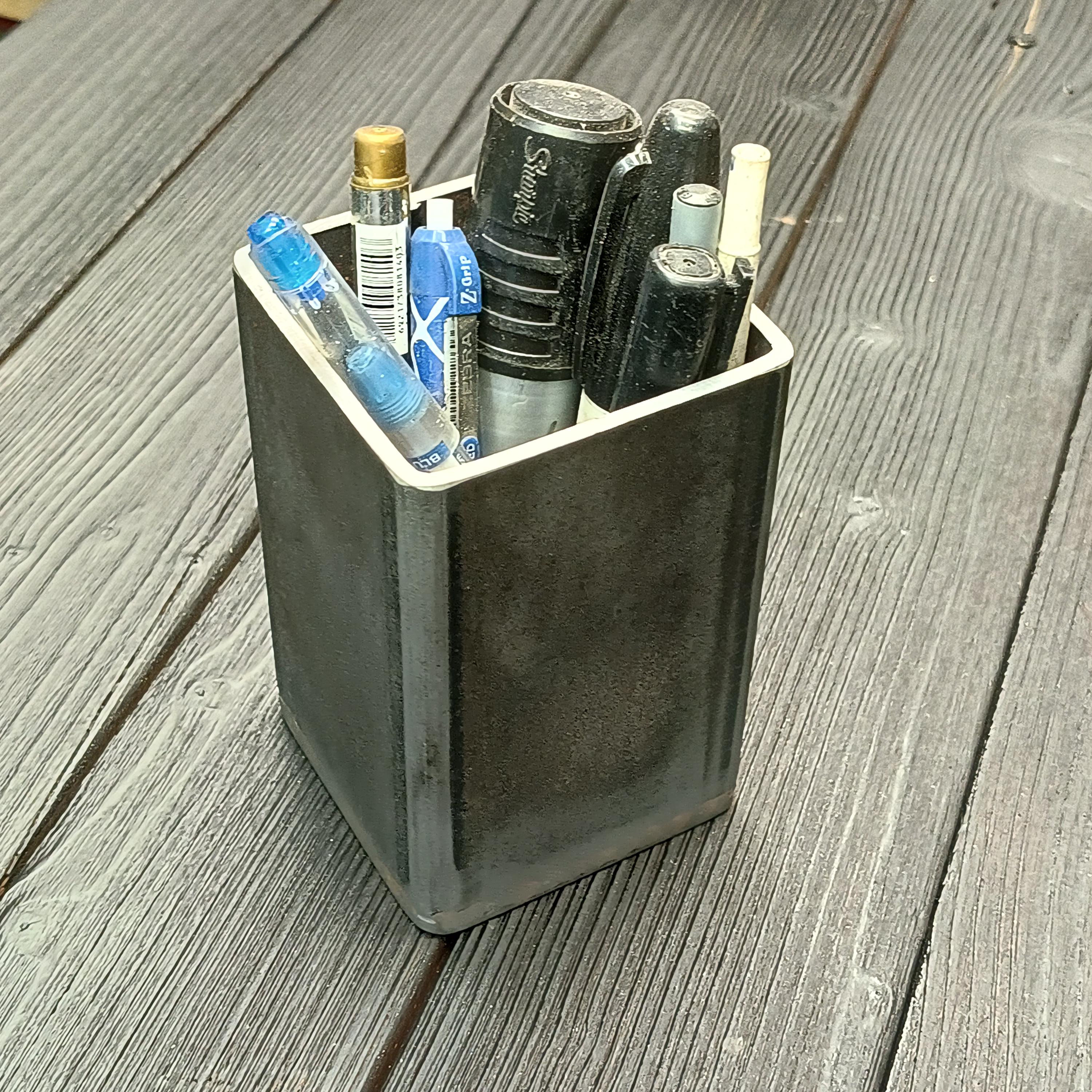 Care instructions: Wipe clean with a damp cloth to maintain its sleek appearance. This durable steel pencil holder is built to withstand daily use and elevate your organizational game with a minimalist, industrial aesthetic. Add this unique piece to your office or creative space today!