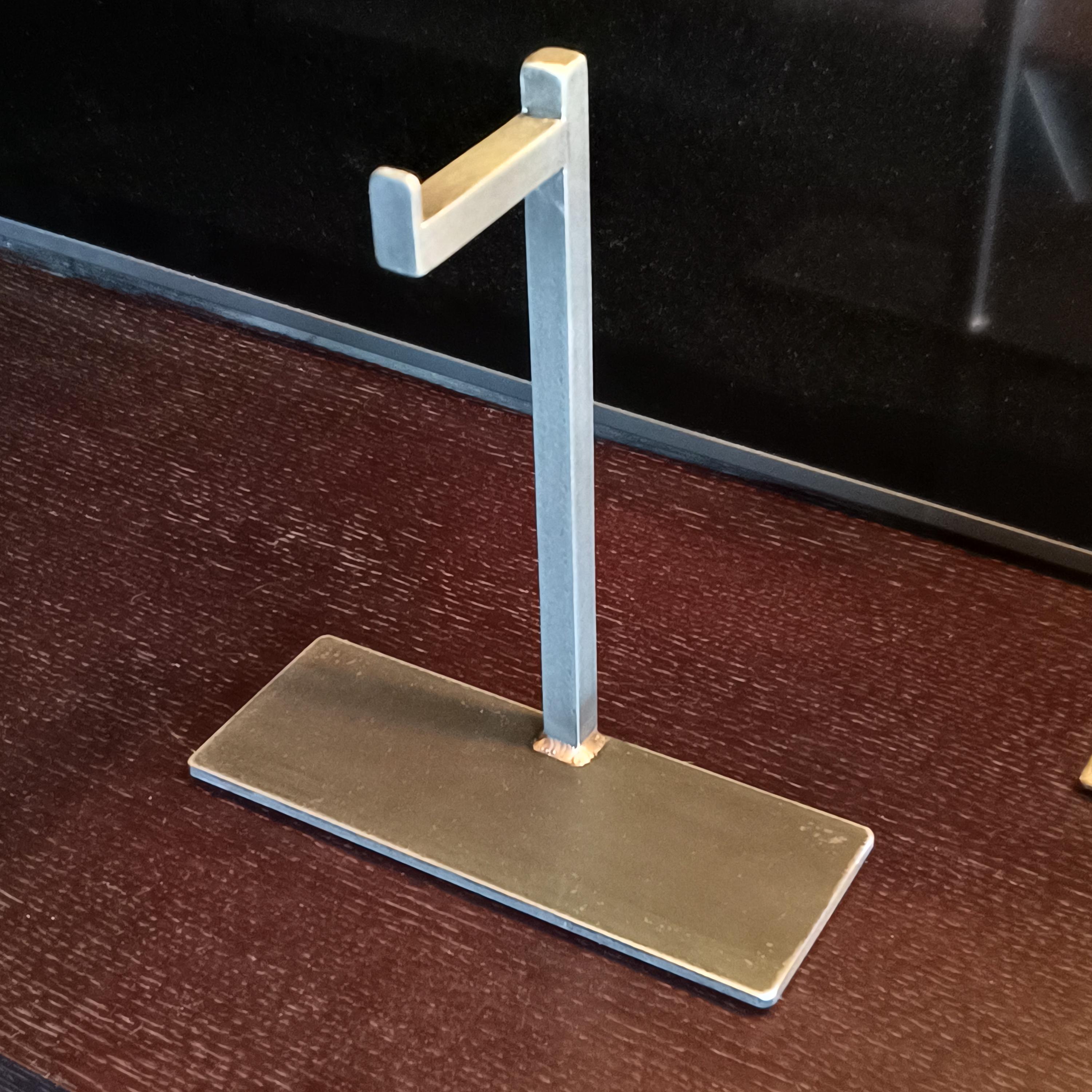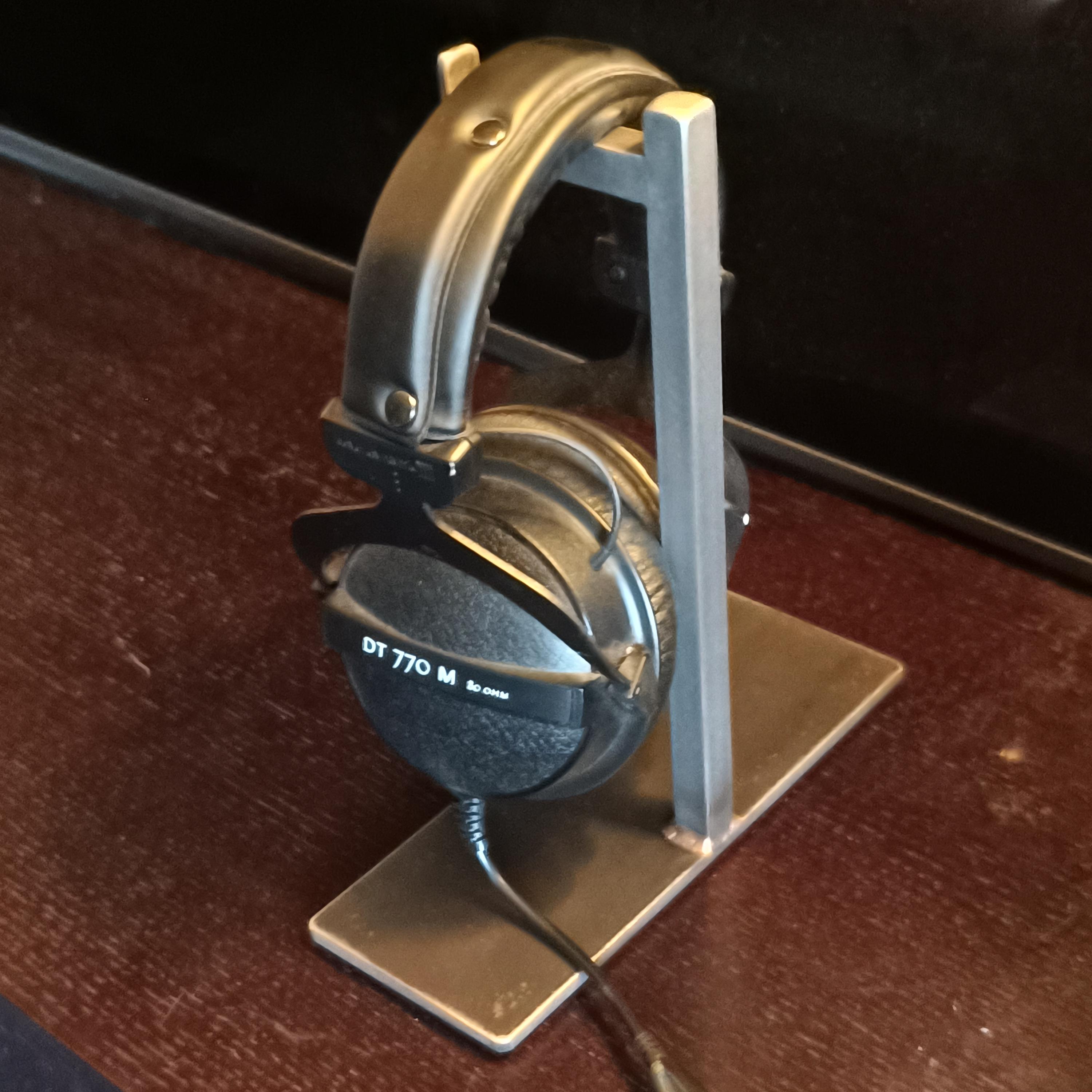 Beautiful and Functional Headphone Stand, solid steel with a subtle matte clearcoat finish.Base measures 3" x 8", with non-marring rubber feet.Half-inch solid steel post measures 9.5" tall.