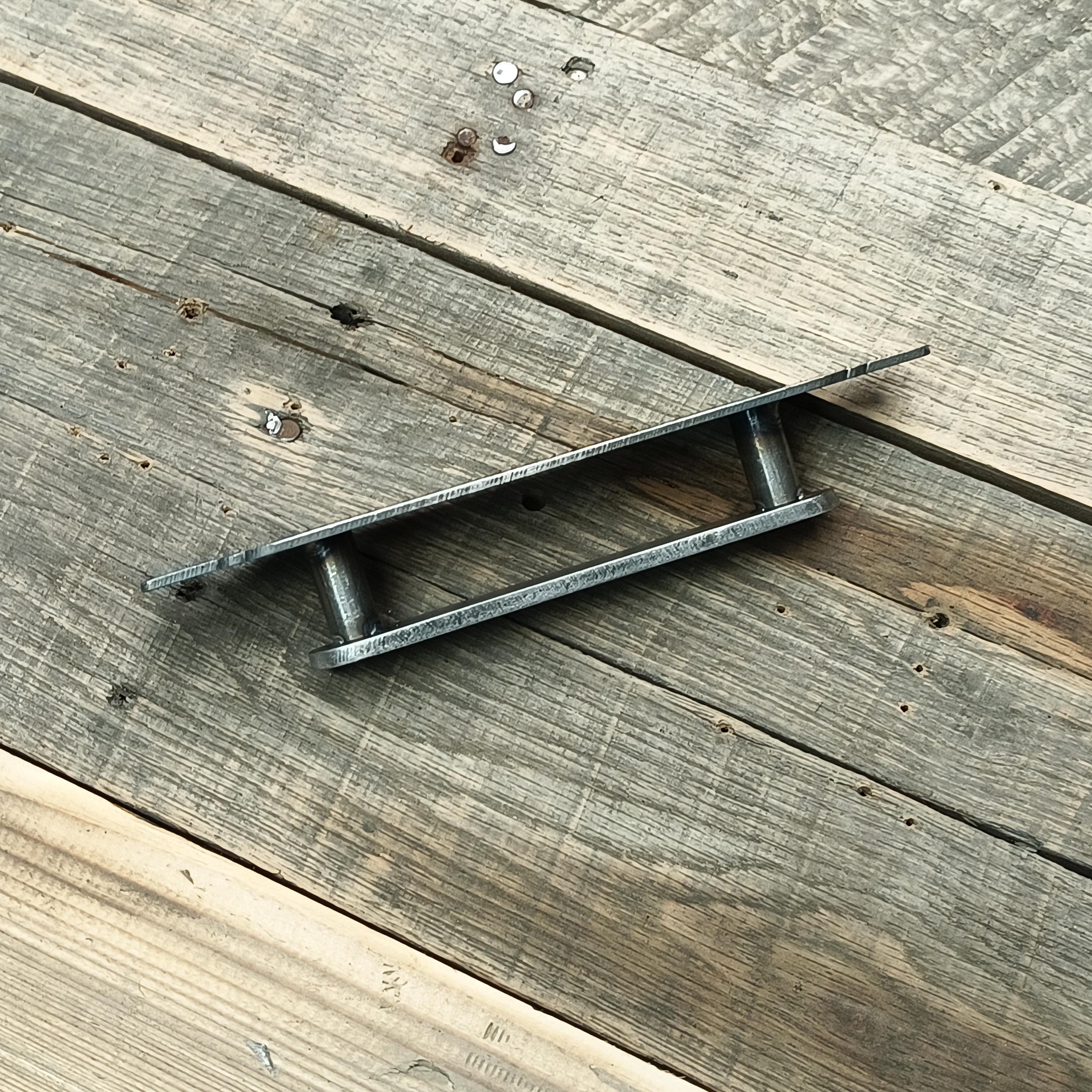 Pictured is an 8" handle, with a 5-1/2" pull in raw steel, no coating.