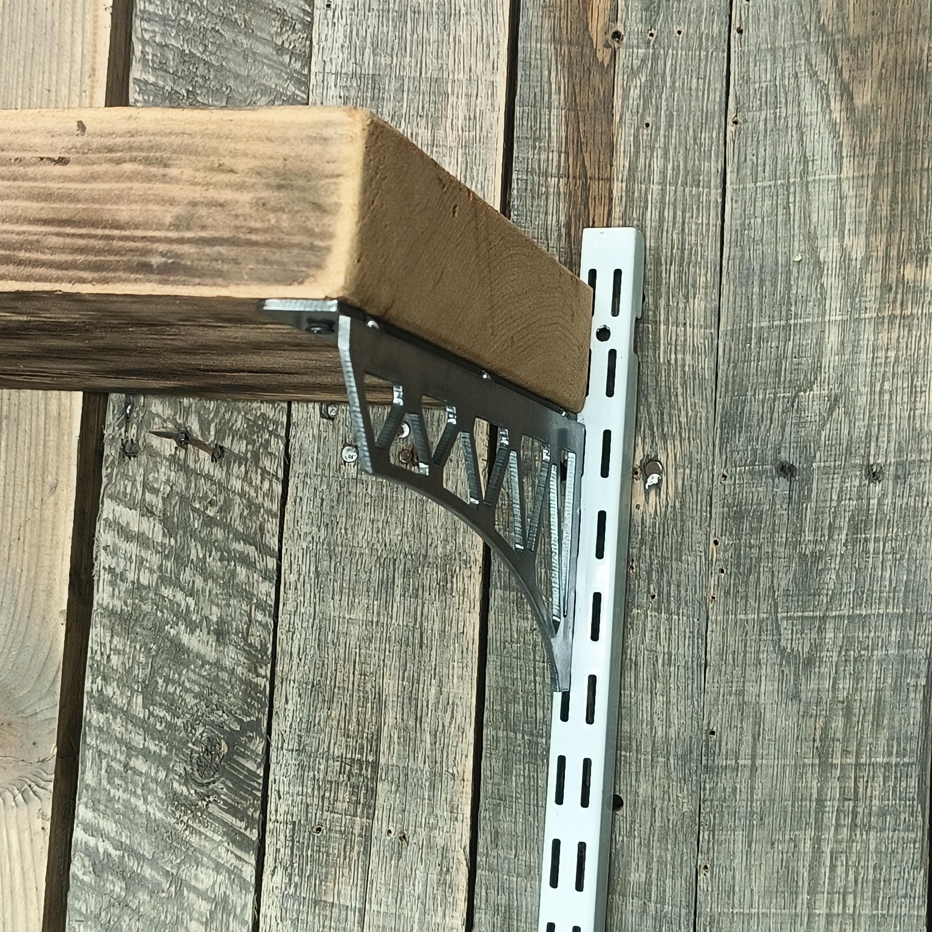 Compatible with many hardware store shelf rail systems with 0.75" x 0.125" slots.