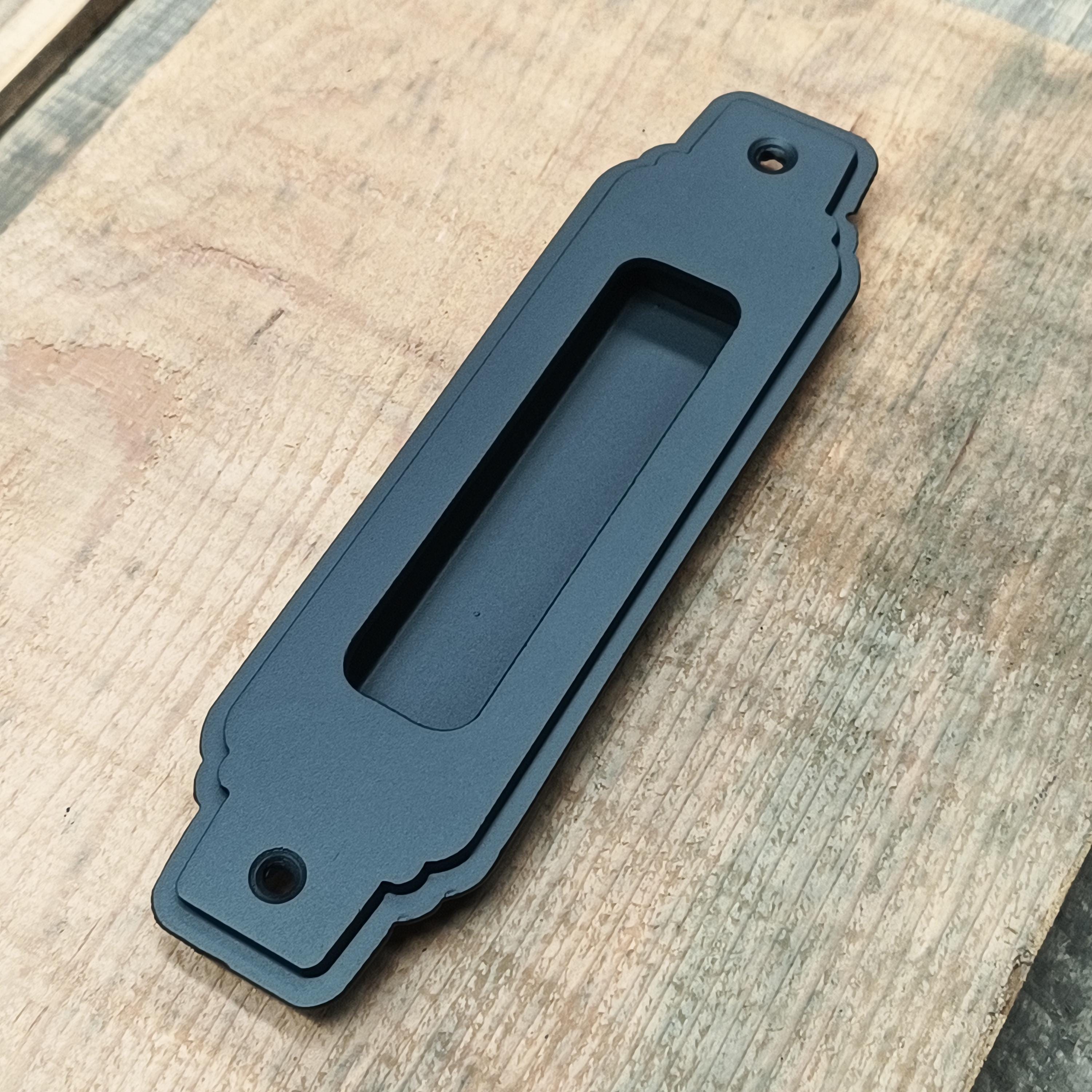 2" Wide Steel Recessed Handle for a Rolling or Sliding Door with Trim detail.