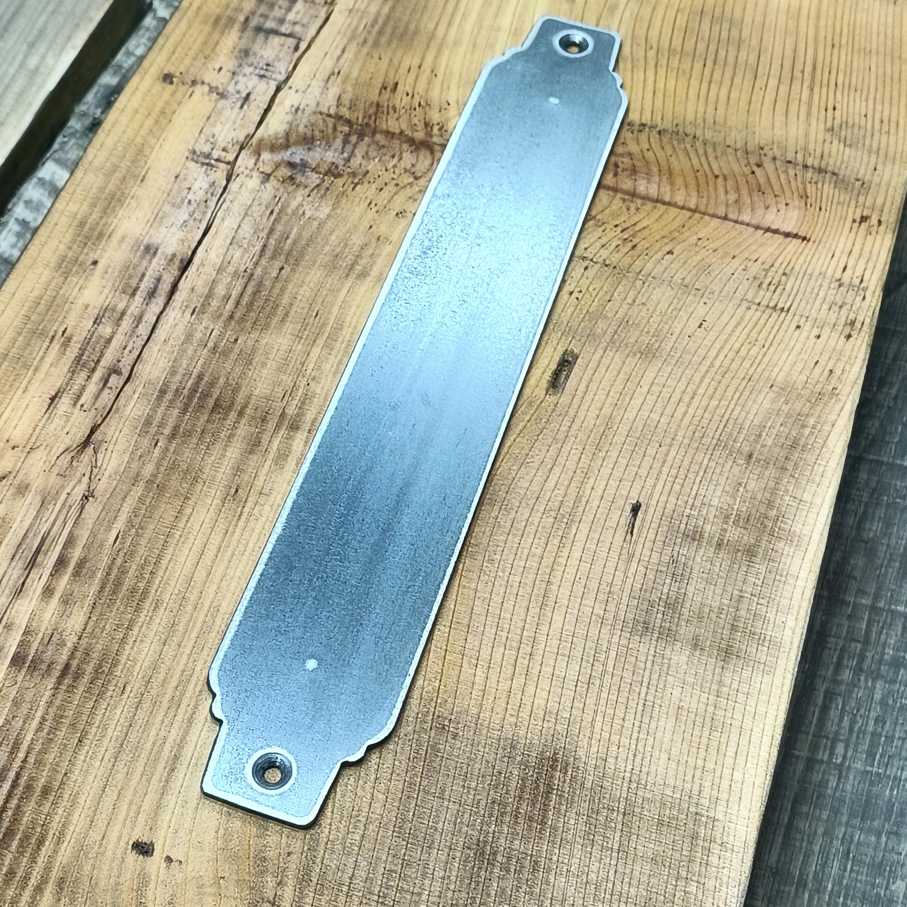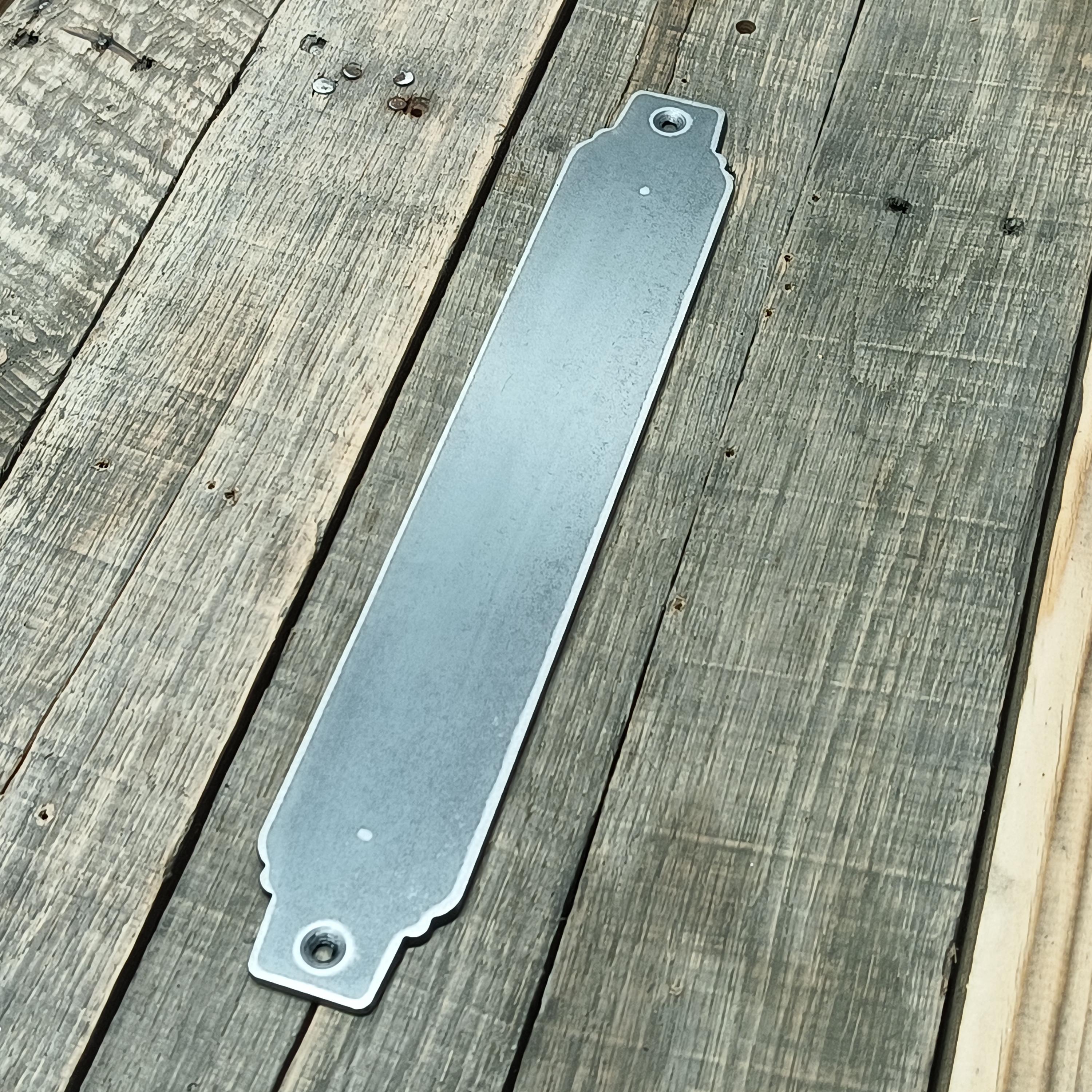 This push plate is made of 2" wide 1/8" thick hot-rolled flat stock. Available raw or with coat of clear to bring out the natural beauty of the mill-scale steel. Also available in solid color Excellent for commercial/exterior use. (When clear coated or painted)