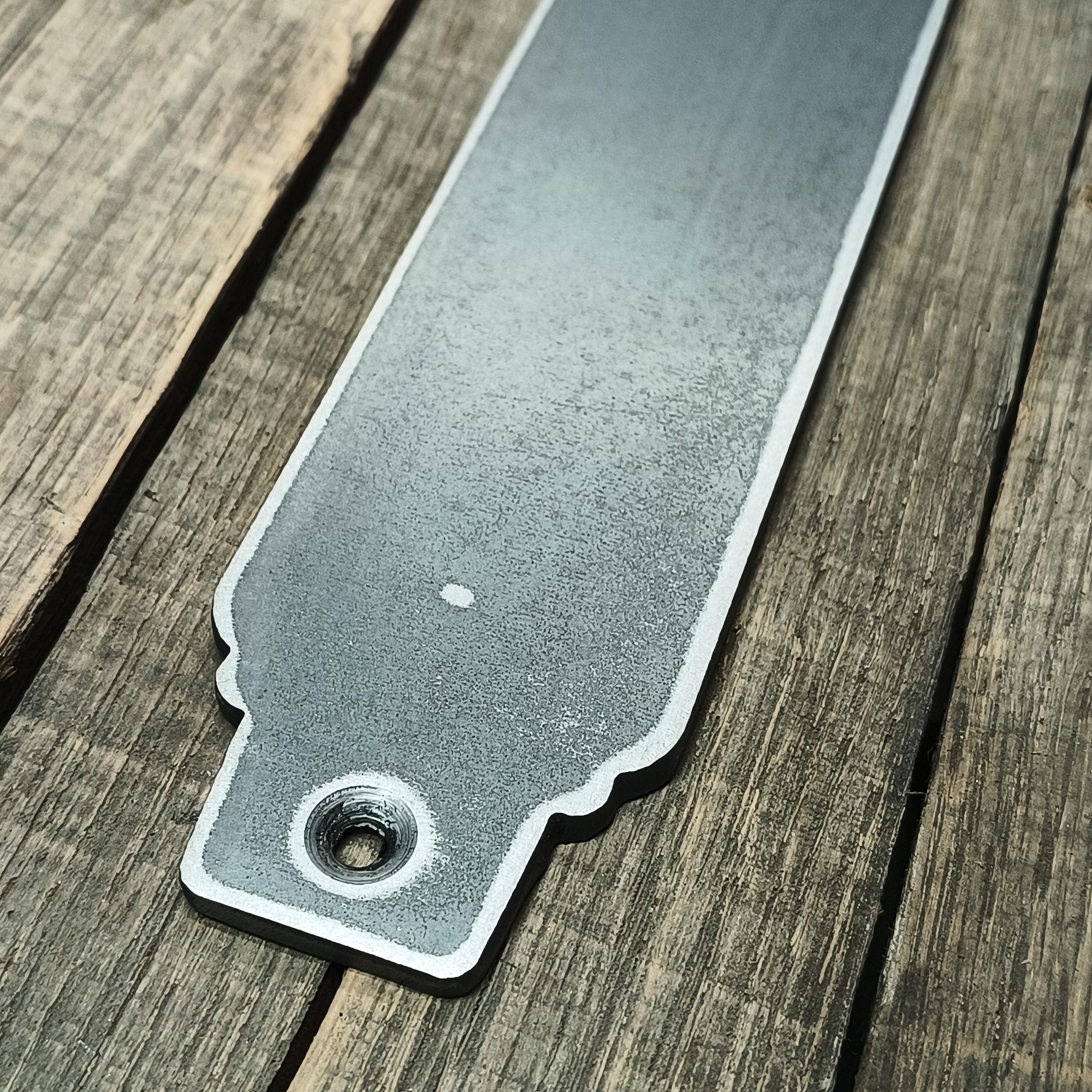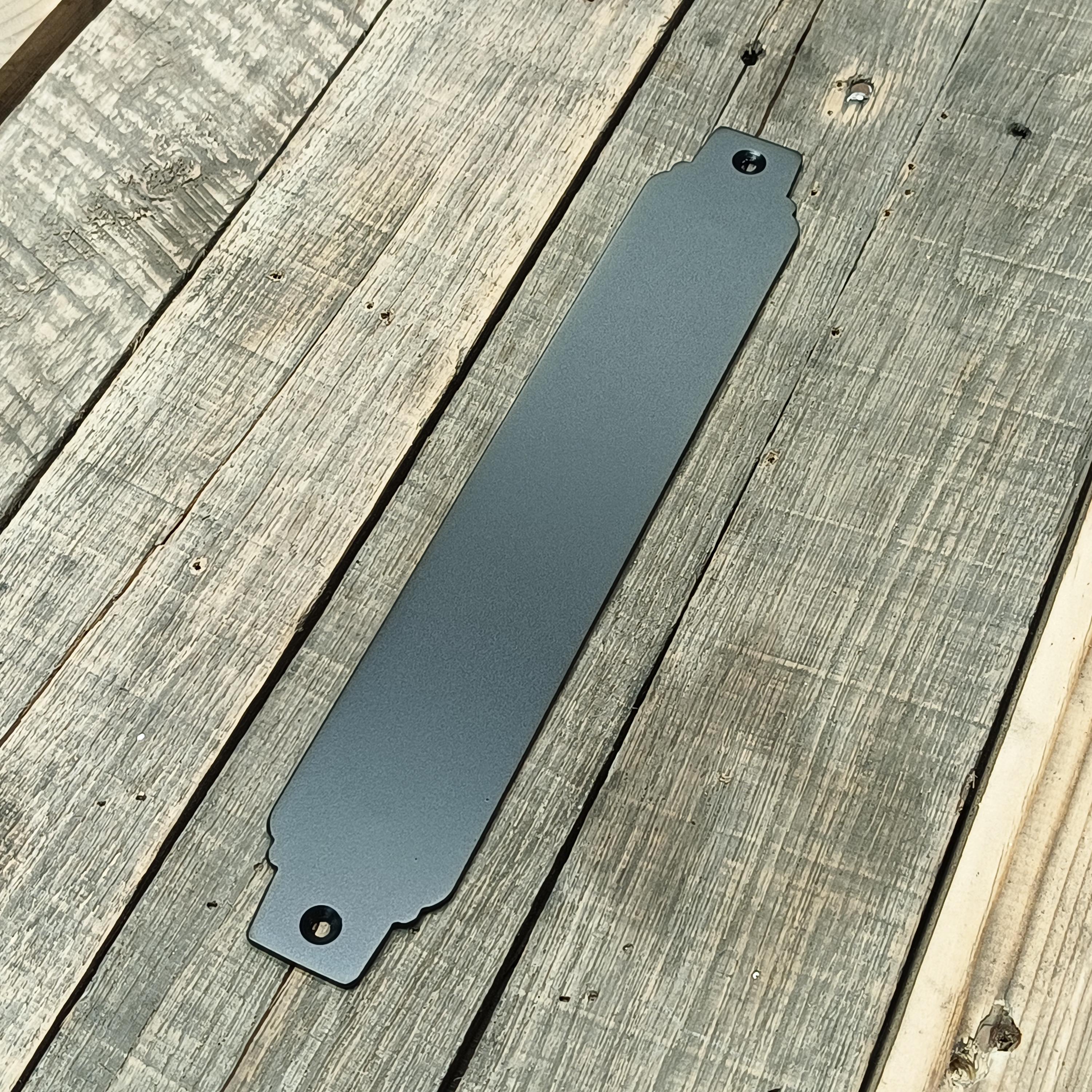 Pictured is a 12" push plate in flat black, raw steel, and raw steel with a flat clearcoat