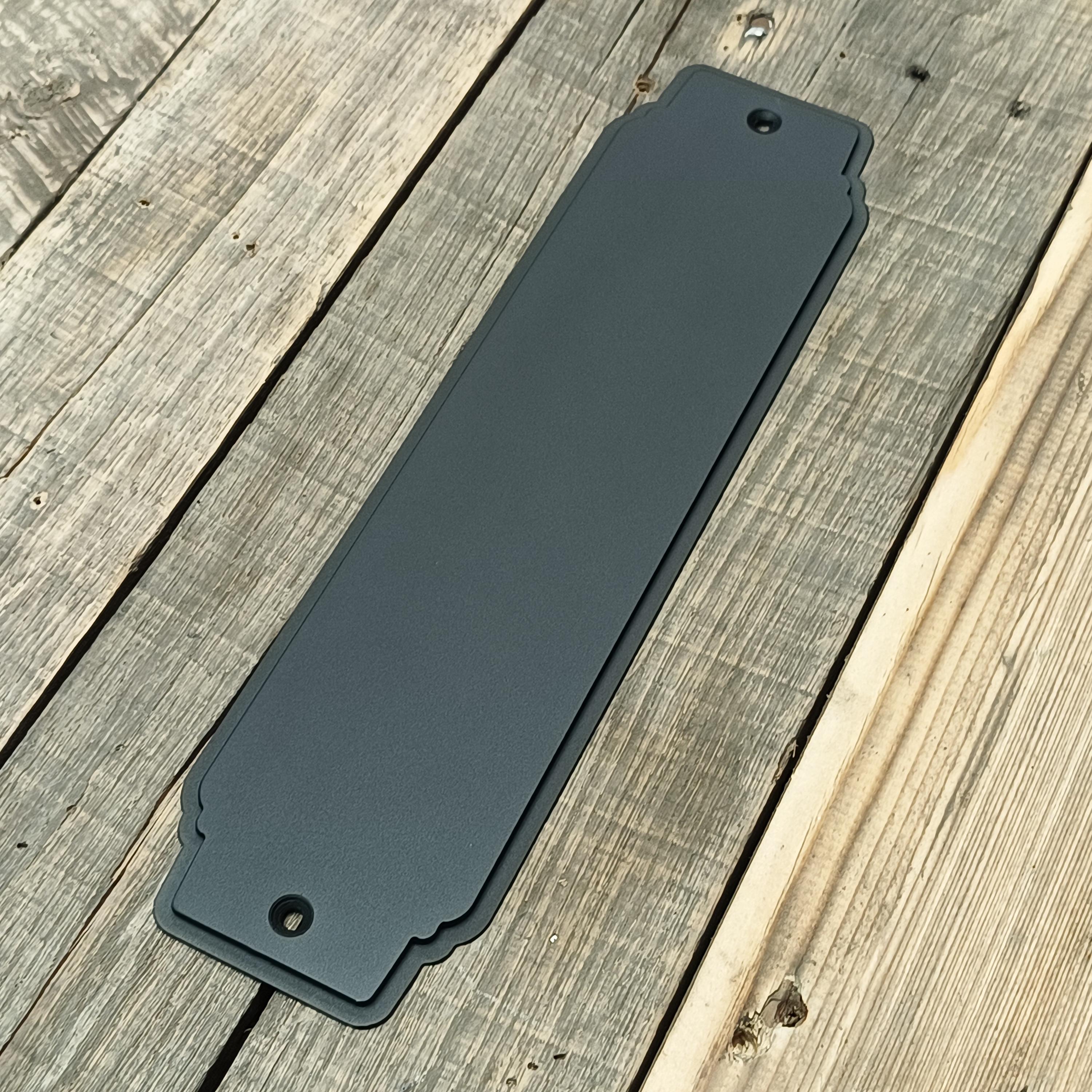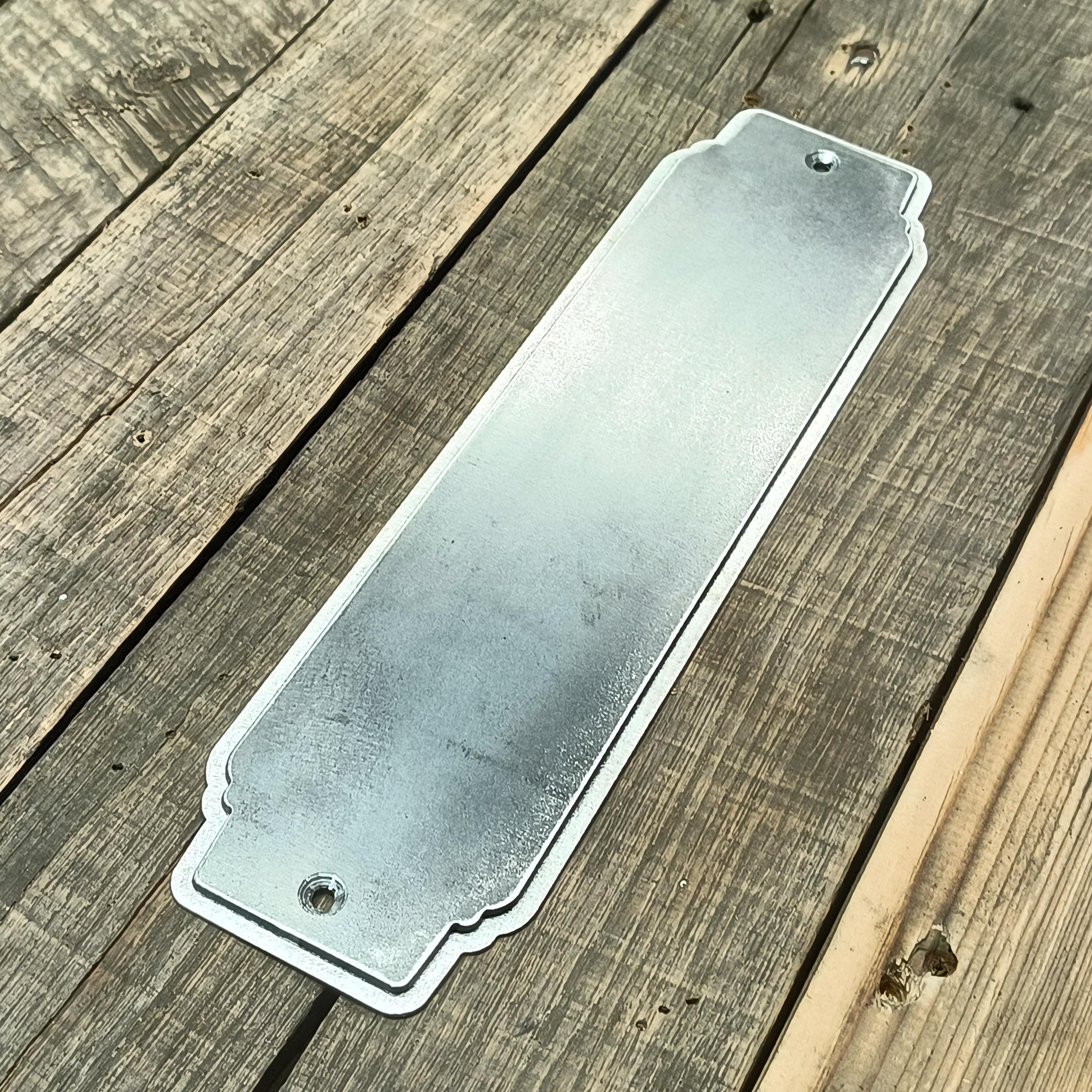 Pictured is a 12" push plate in flat black as well as raw steel, no coating.