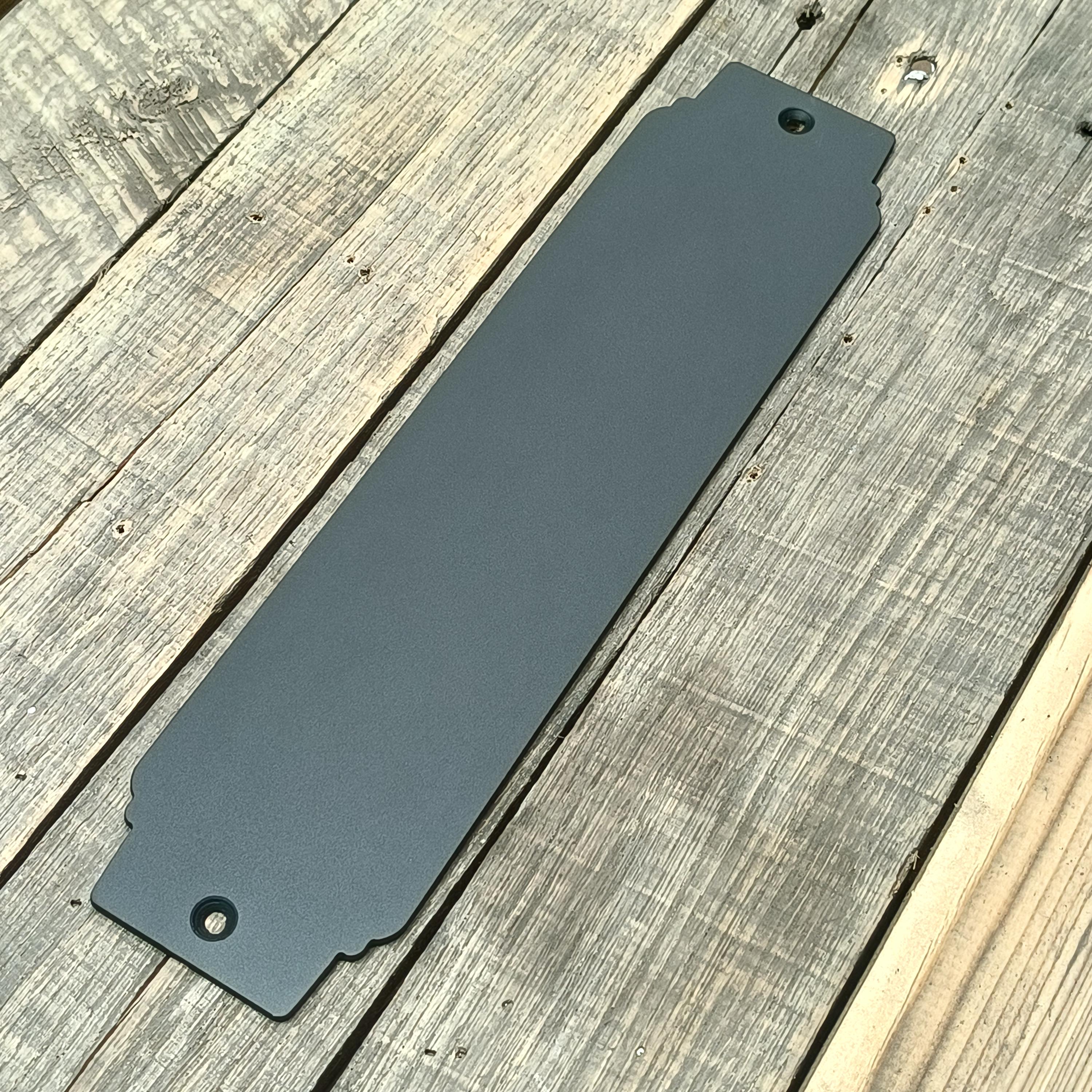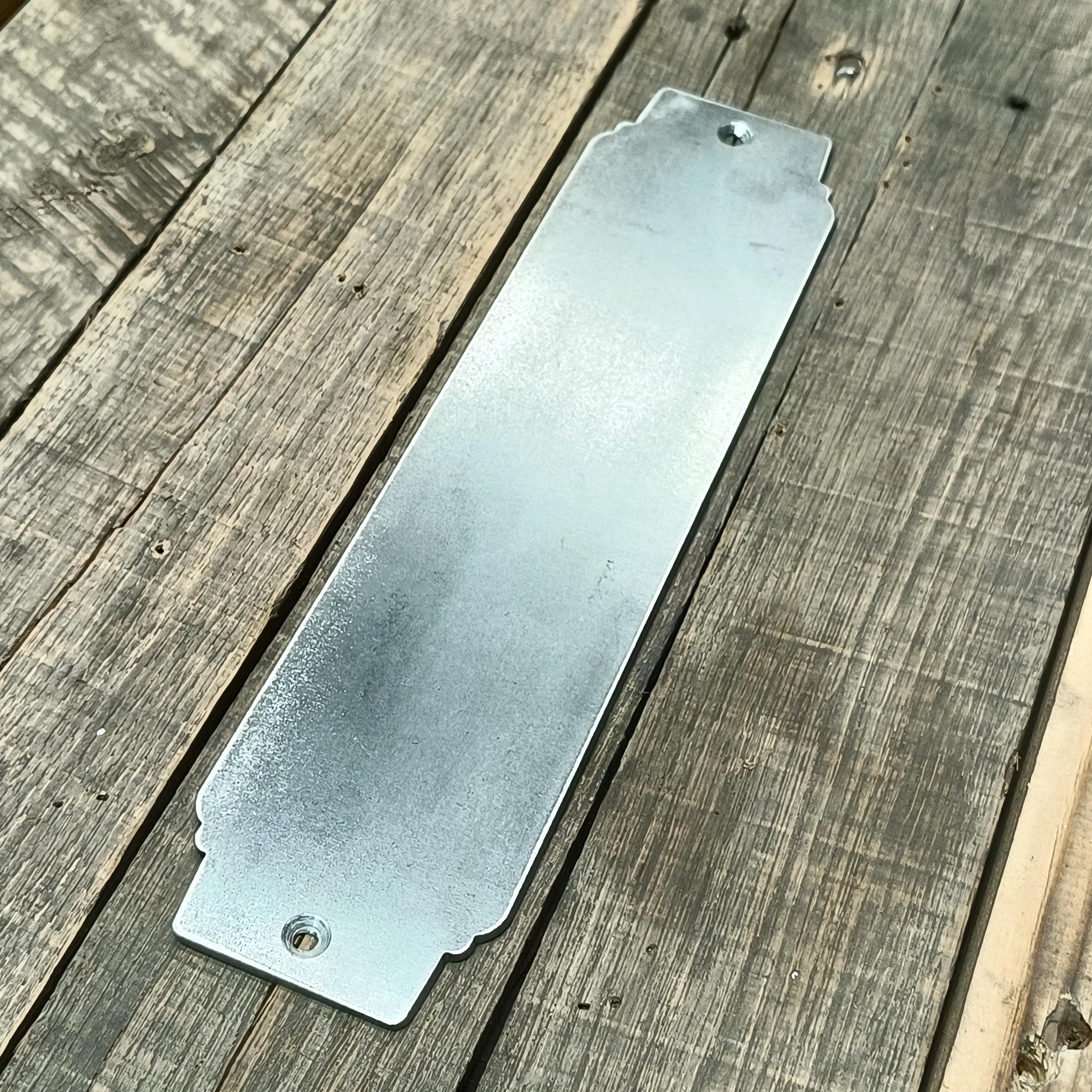 Pictured is a 12" push plate in flat black, raw steel, and raw steel with a flat clearcoat