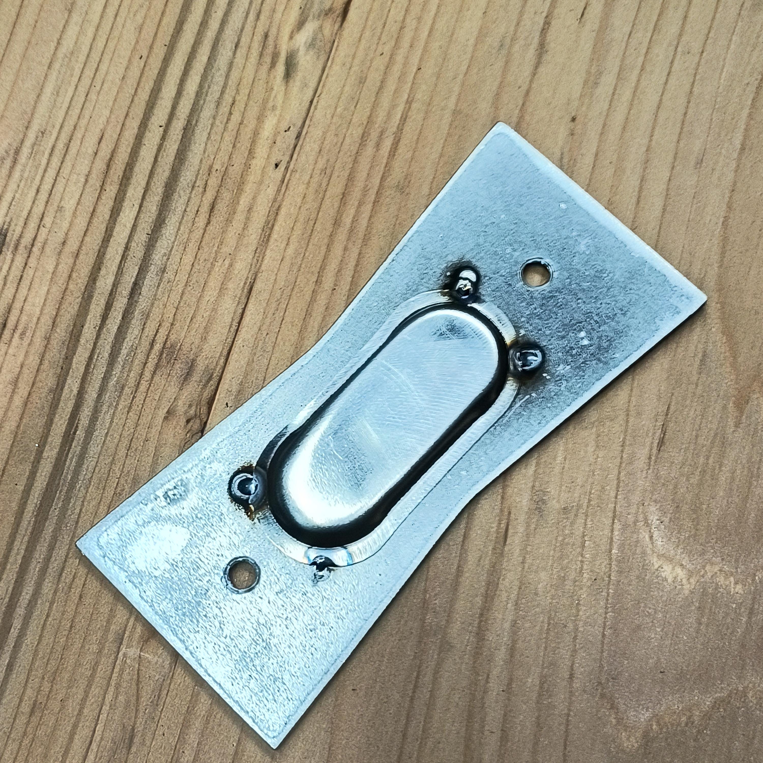 Low-projection closed back, custom made die-pressed steel. Squared hourglass plate.