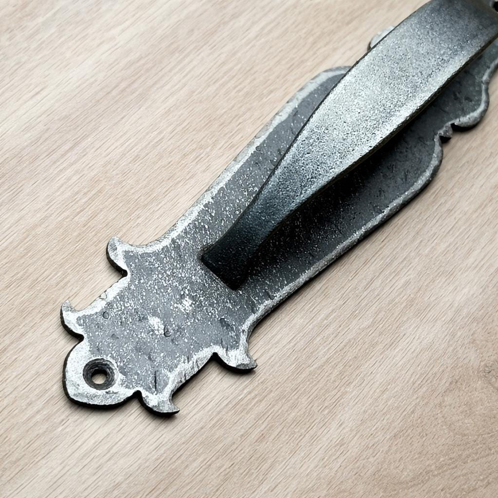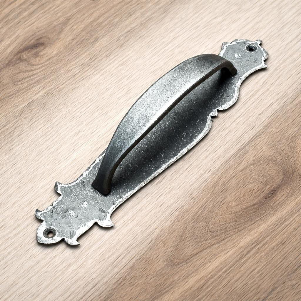 Pictured finished in Hand-hammered raw steel, flat clear.