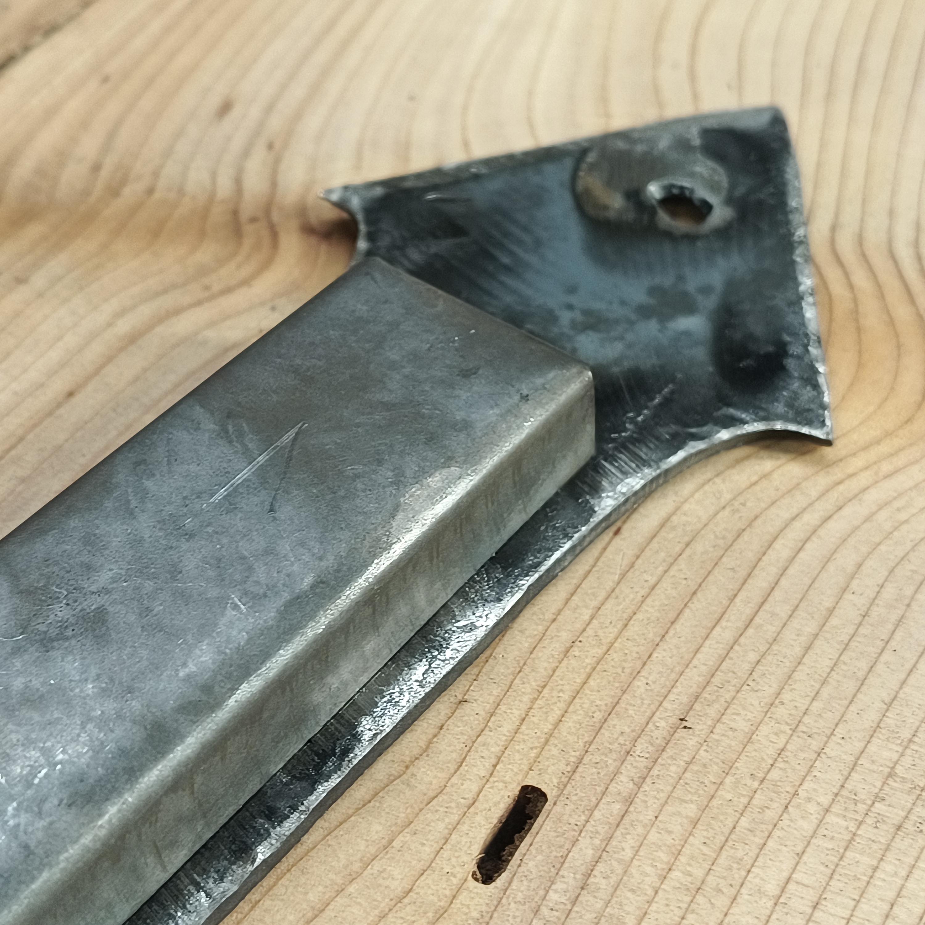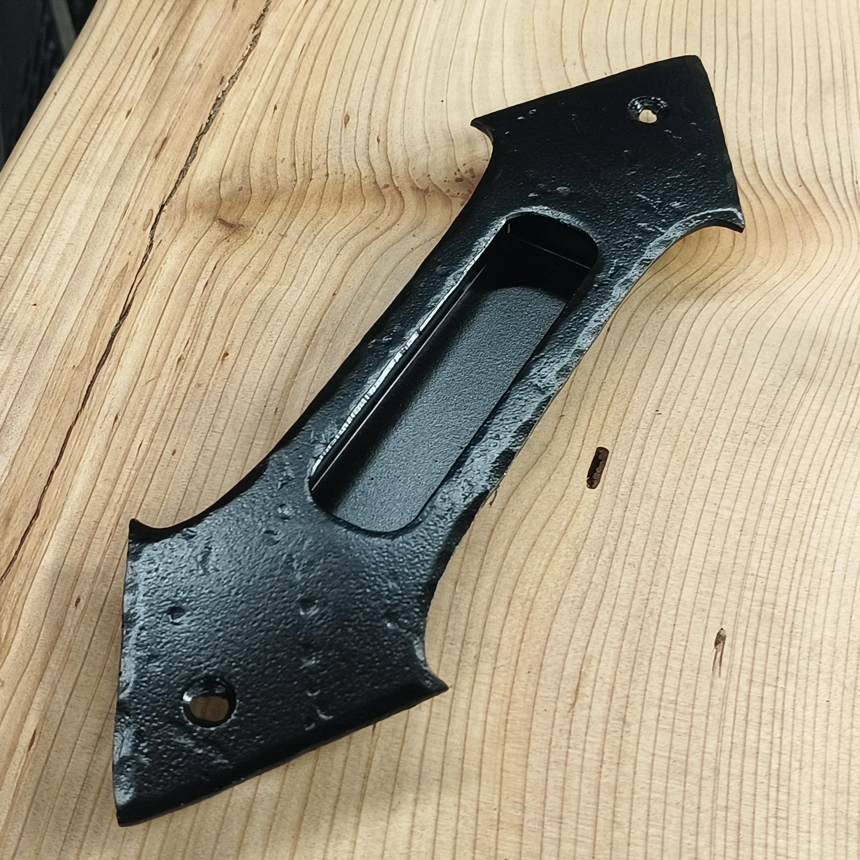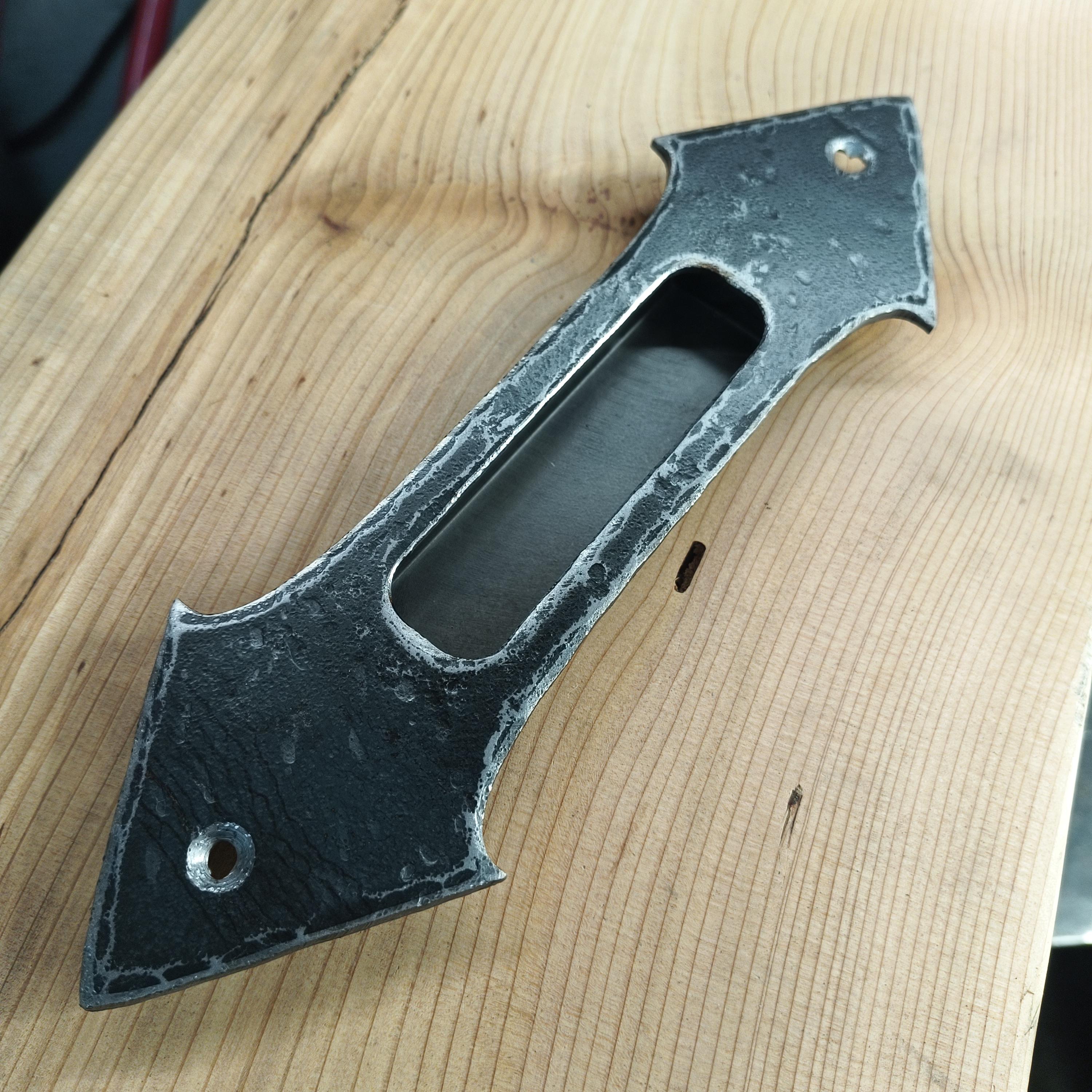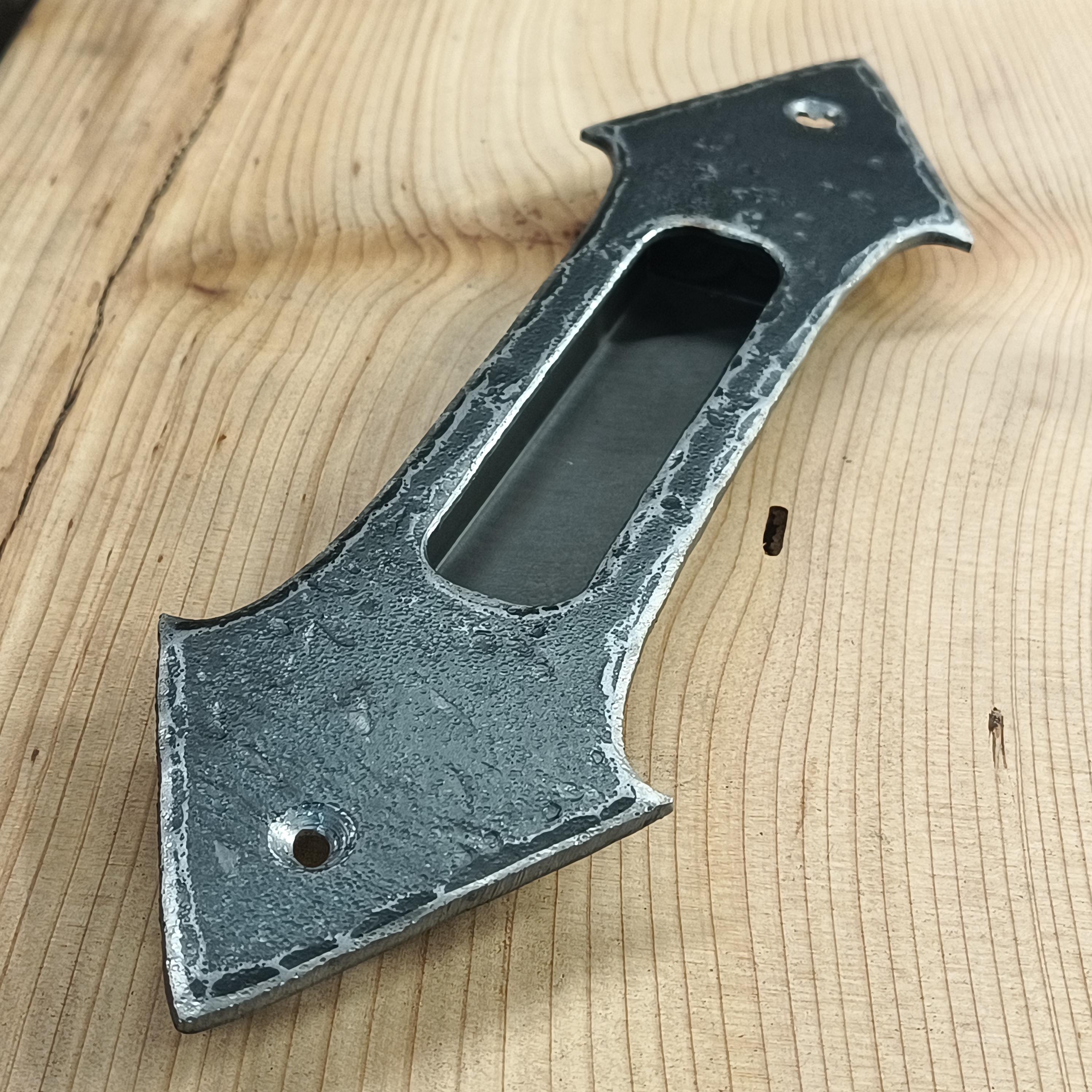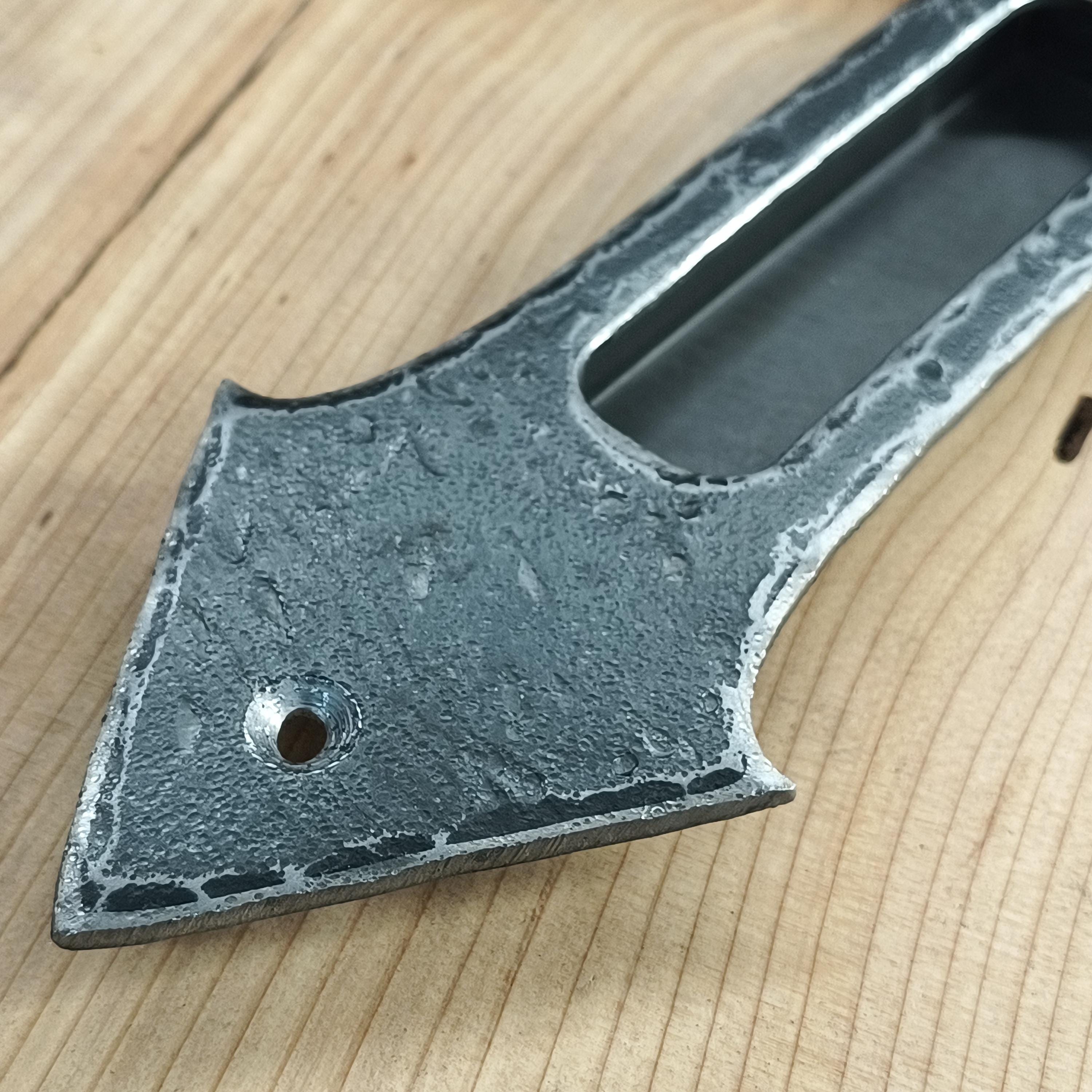 Pictured finished in Hand-hammered raw steel, flat clear as well as black.