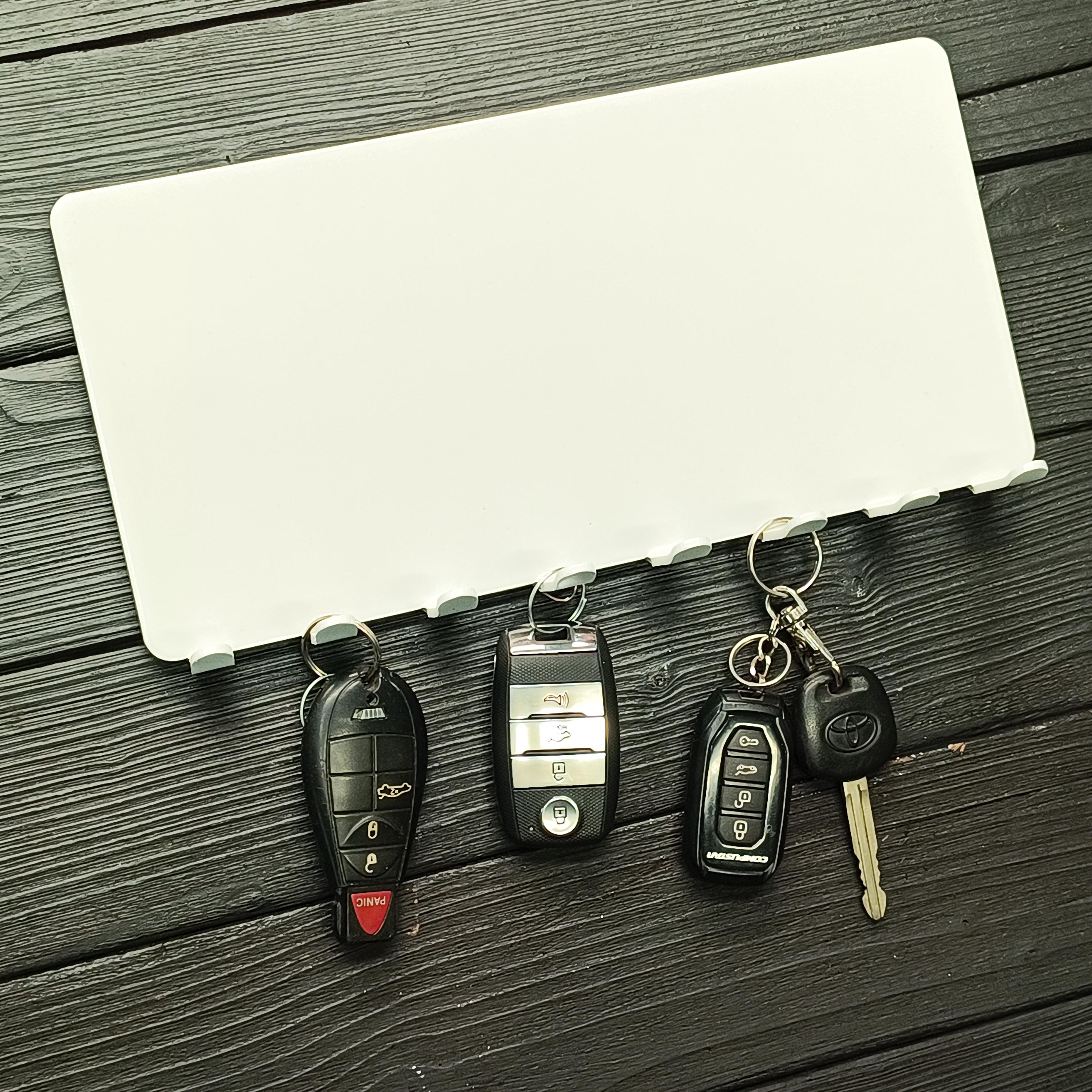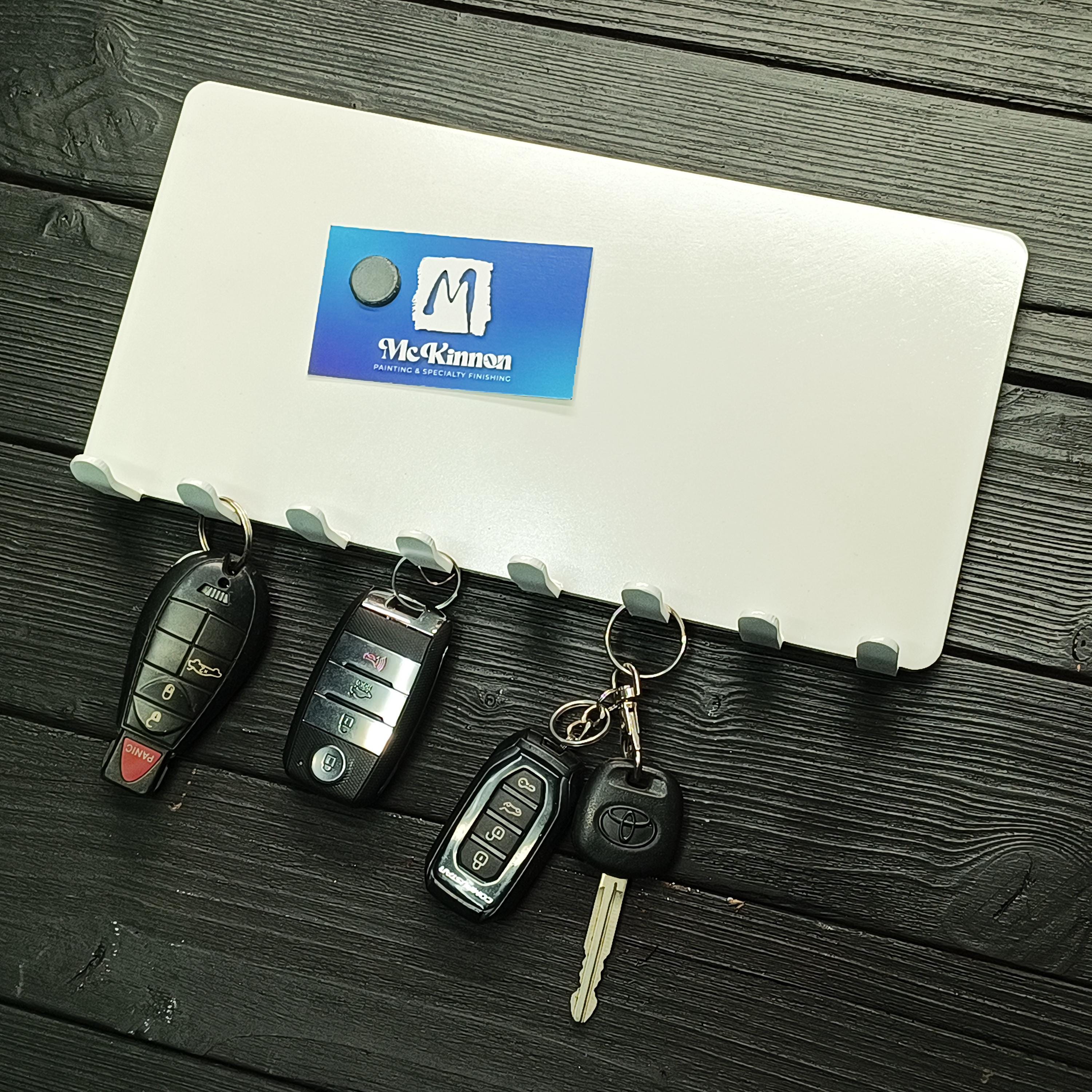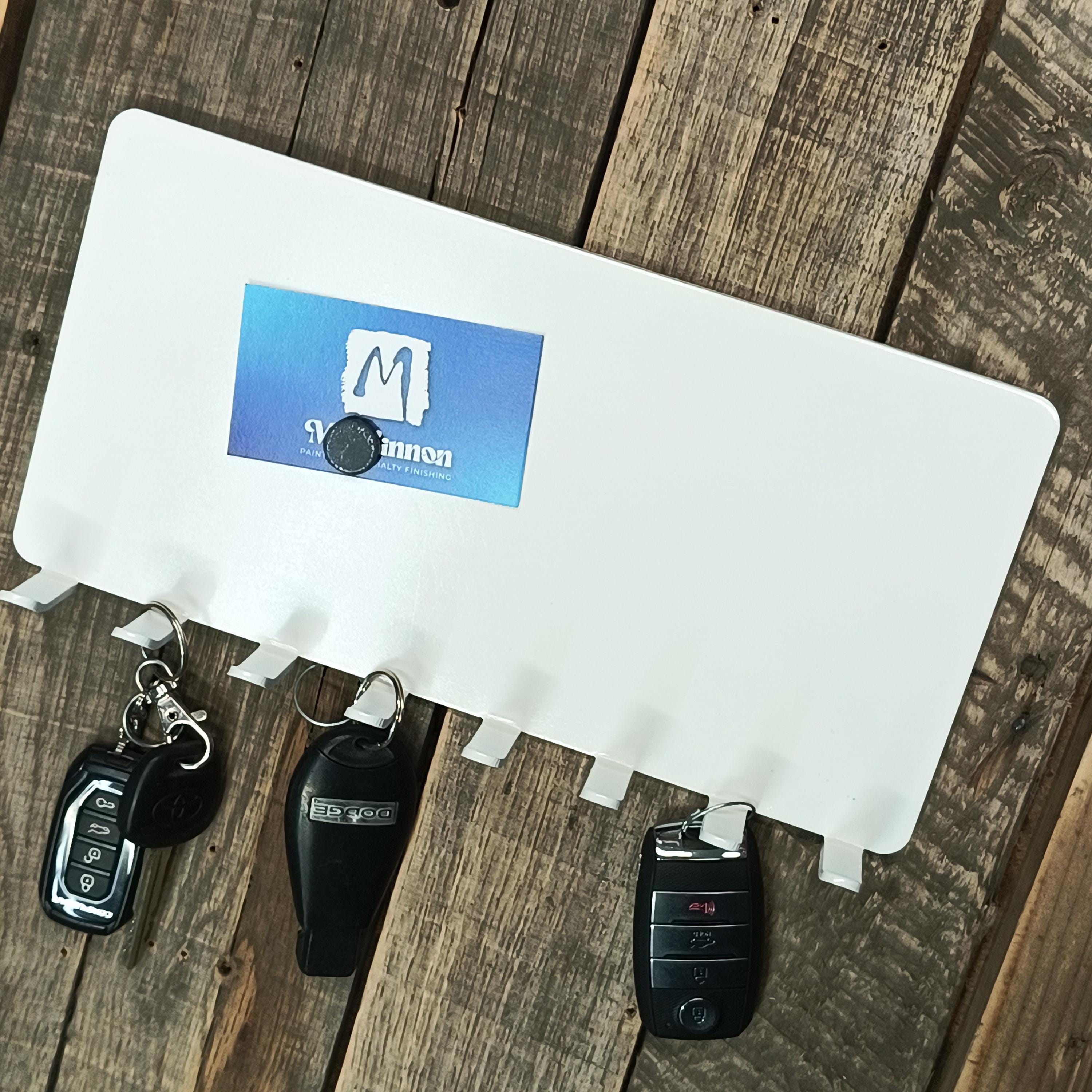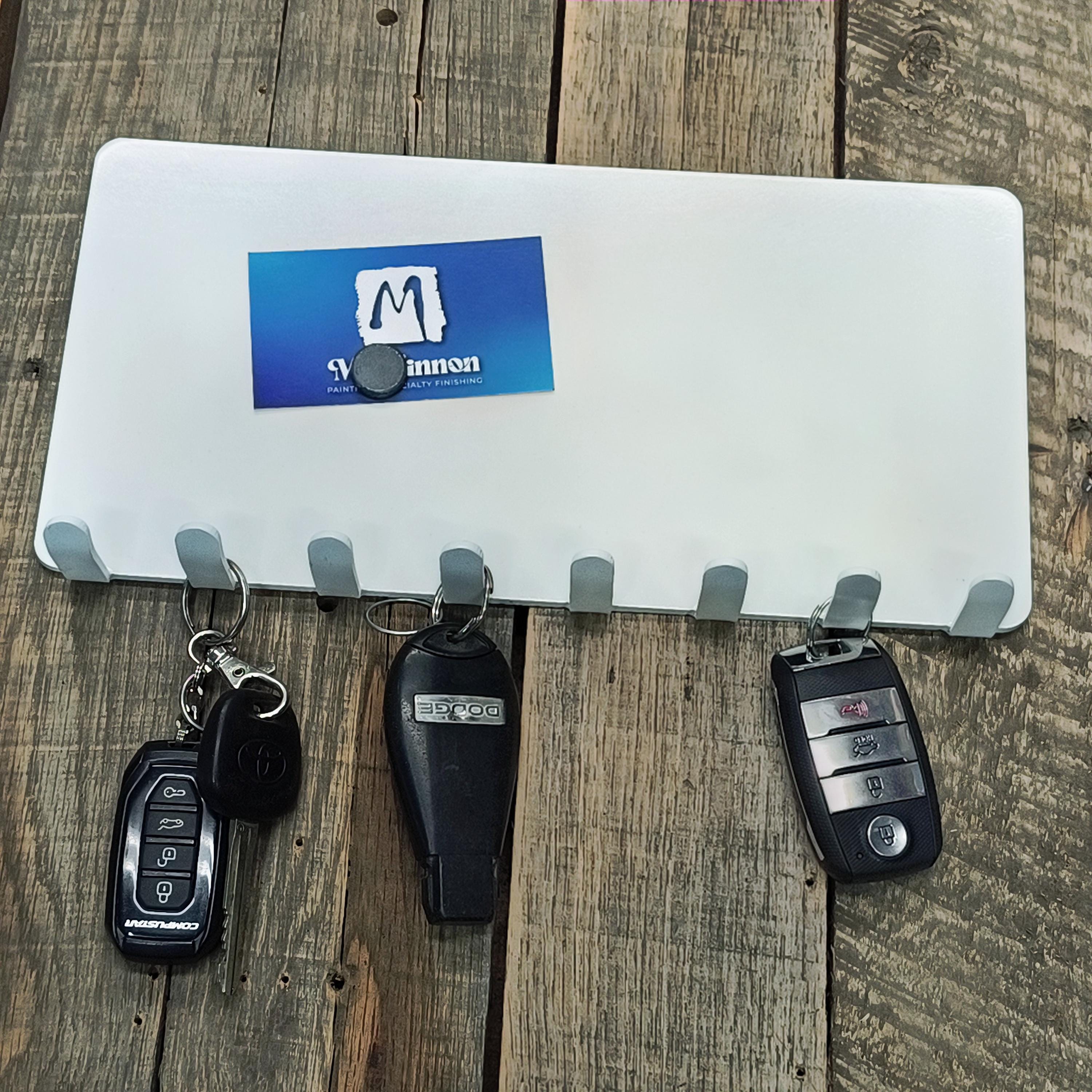 Minimalist Magnetic Key Rack, 8 fingers. Hand made and finished to order.At a glance:Available painted or raw.Measures 12" x 6"Hidden mounting tabs.Show in Gloss WhiteCan me made to custom sizes, mounting configurations.