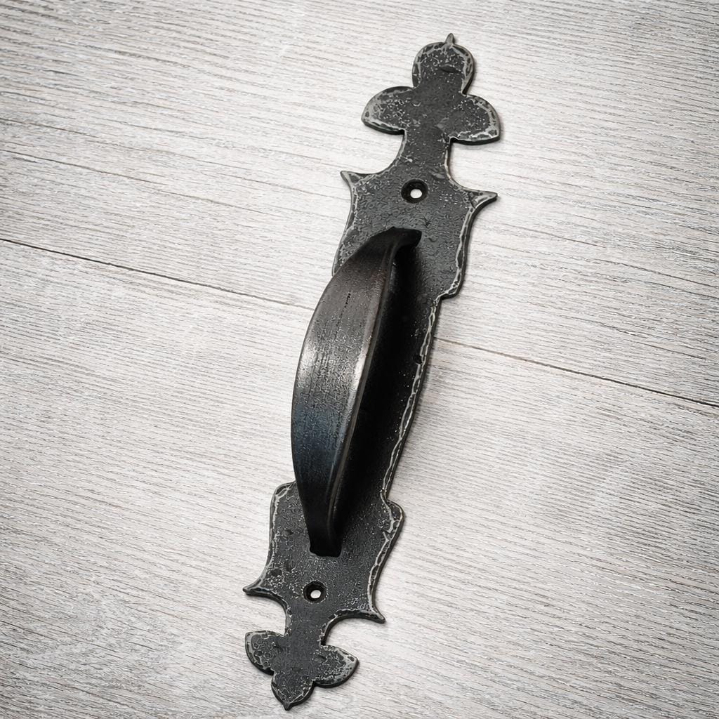 Pictured finished in Hand-hammered raw steel, flat clear.