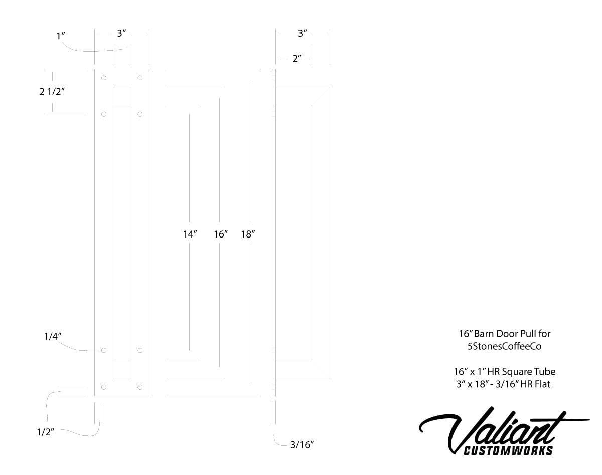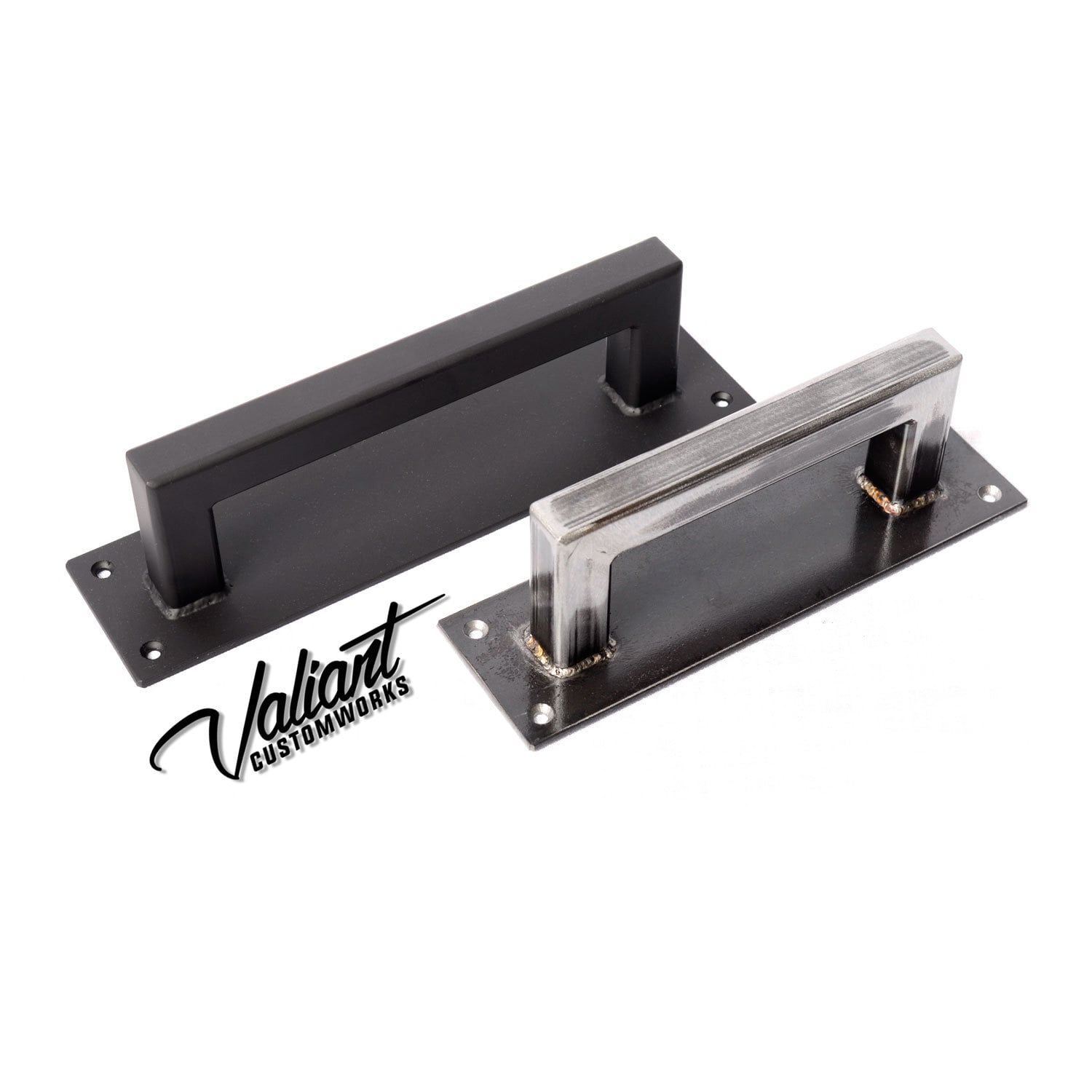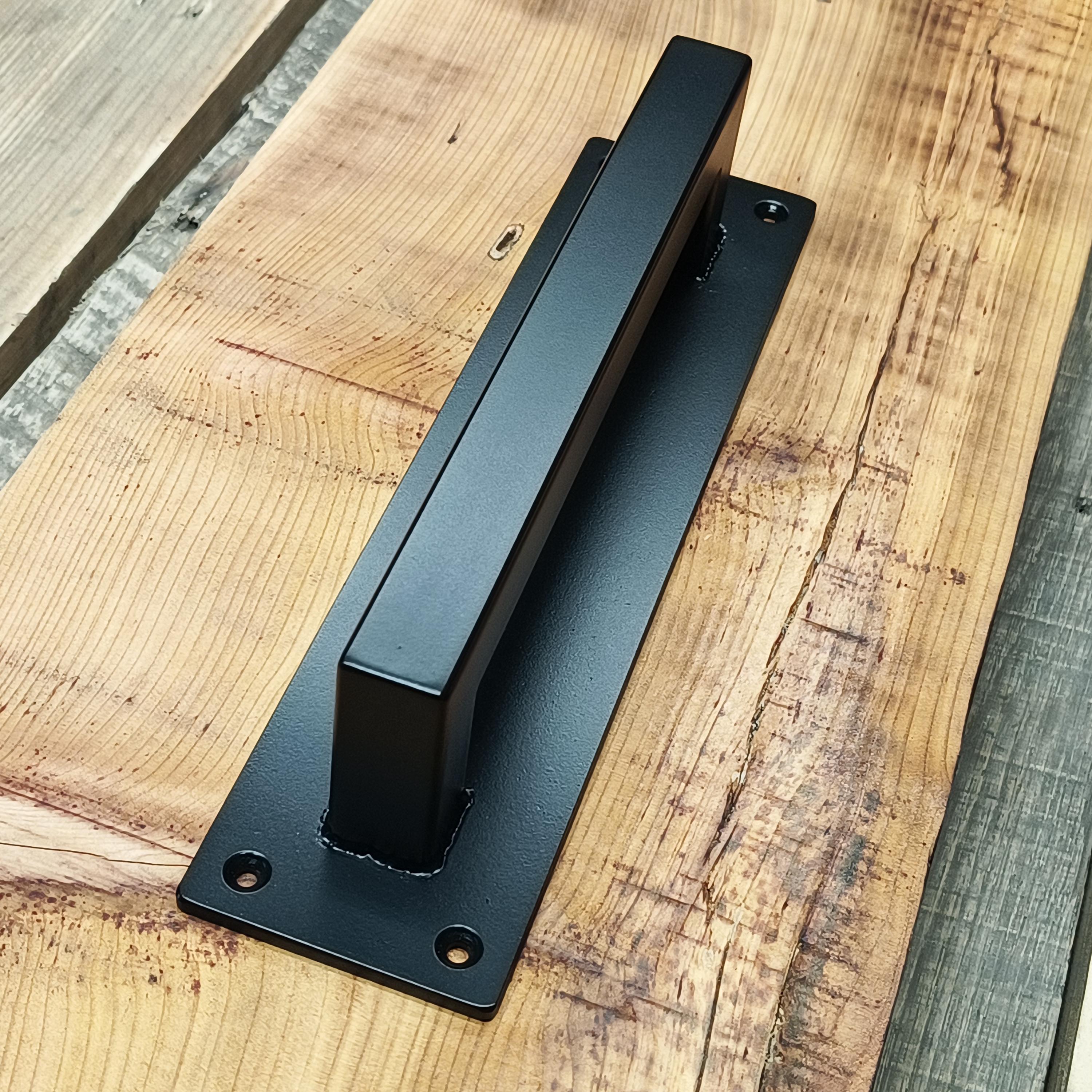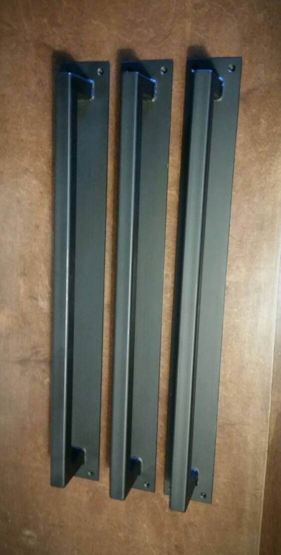 This barn door handle is made of structural grade 1" square tube and will stand up to any punishment you could throw at it. Welds are ground clean and smoothed. Once its finished, the whole piece gets a coat of clear to bring out the natural beauty of the mill-scale steel. Excellent for commercial/exterior use.