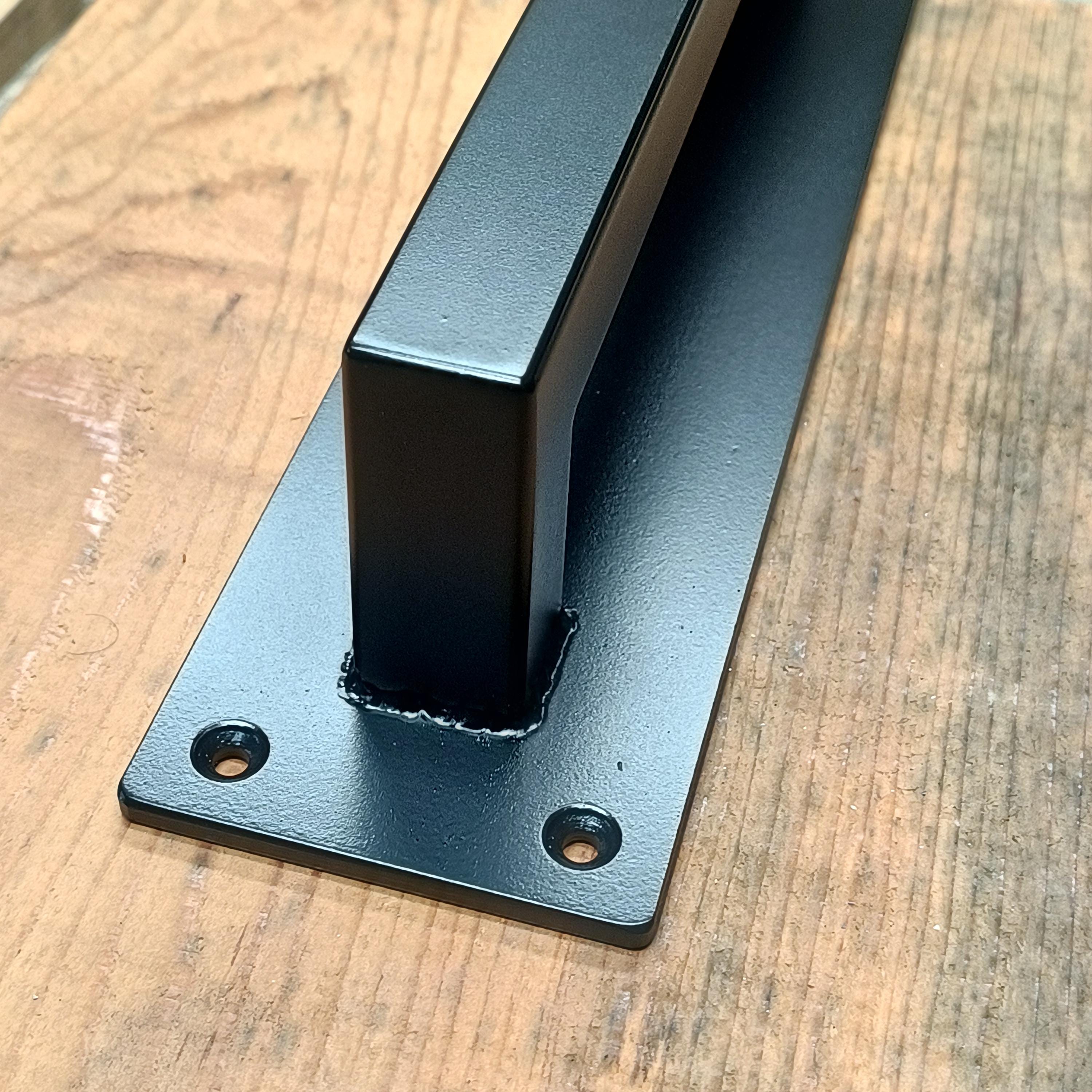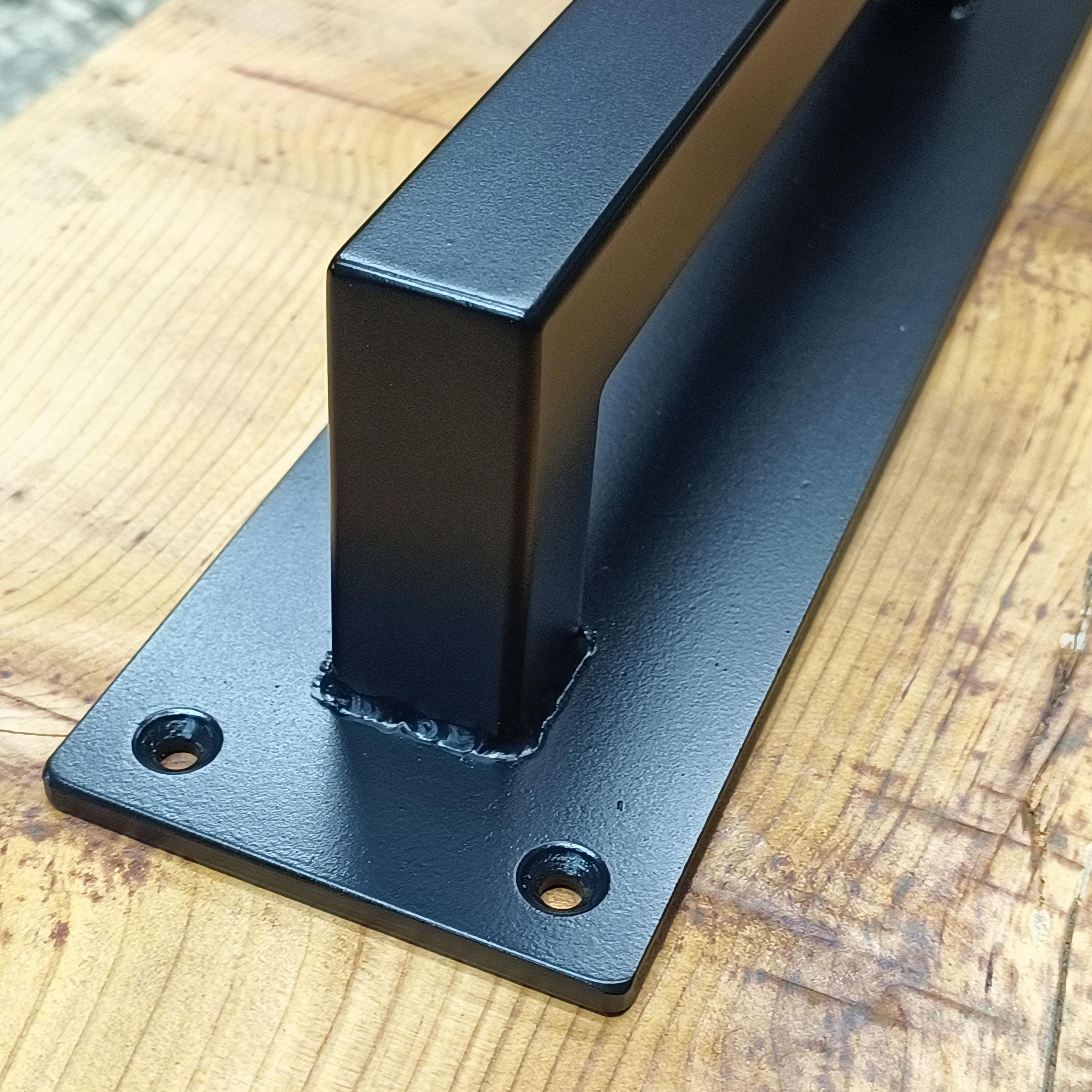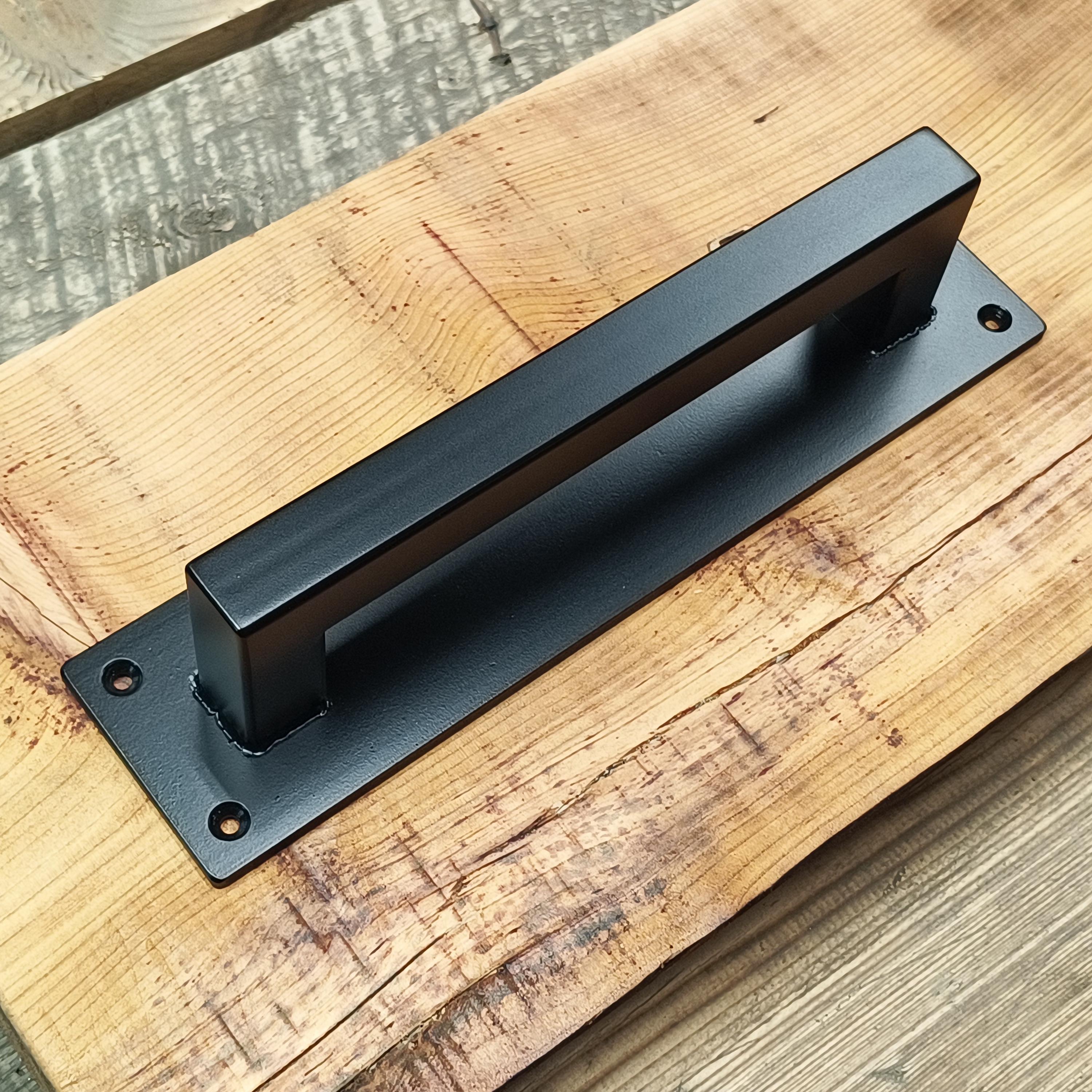 This barn door handle is made of structural grade 1" square tube and will stand up to any punishment you could throw at it. Welds are ground clean and smoothed. Once its finished, the whole piece gets a coat of clear to bring out the natural beauty of the mill-scale steel. Excellent for commercial/exterior use.
