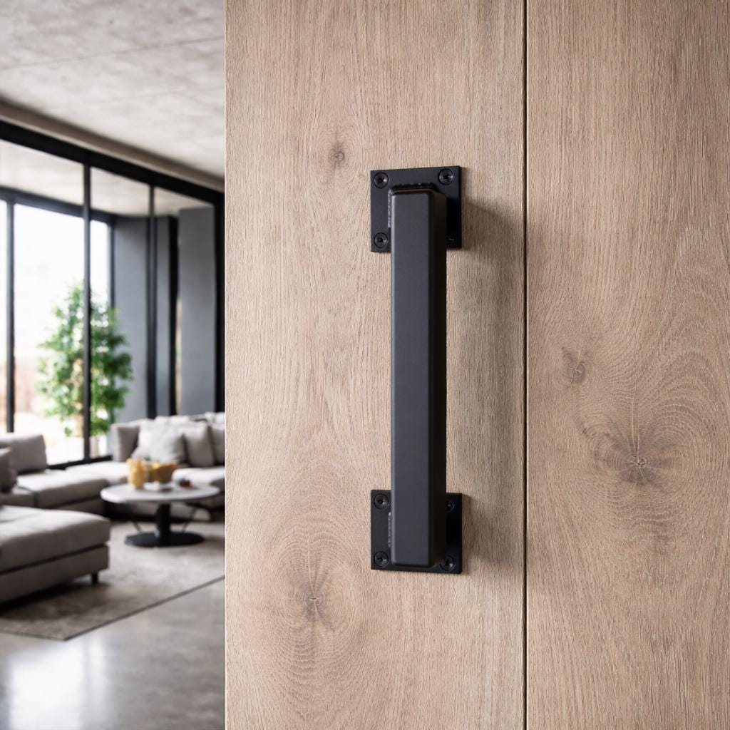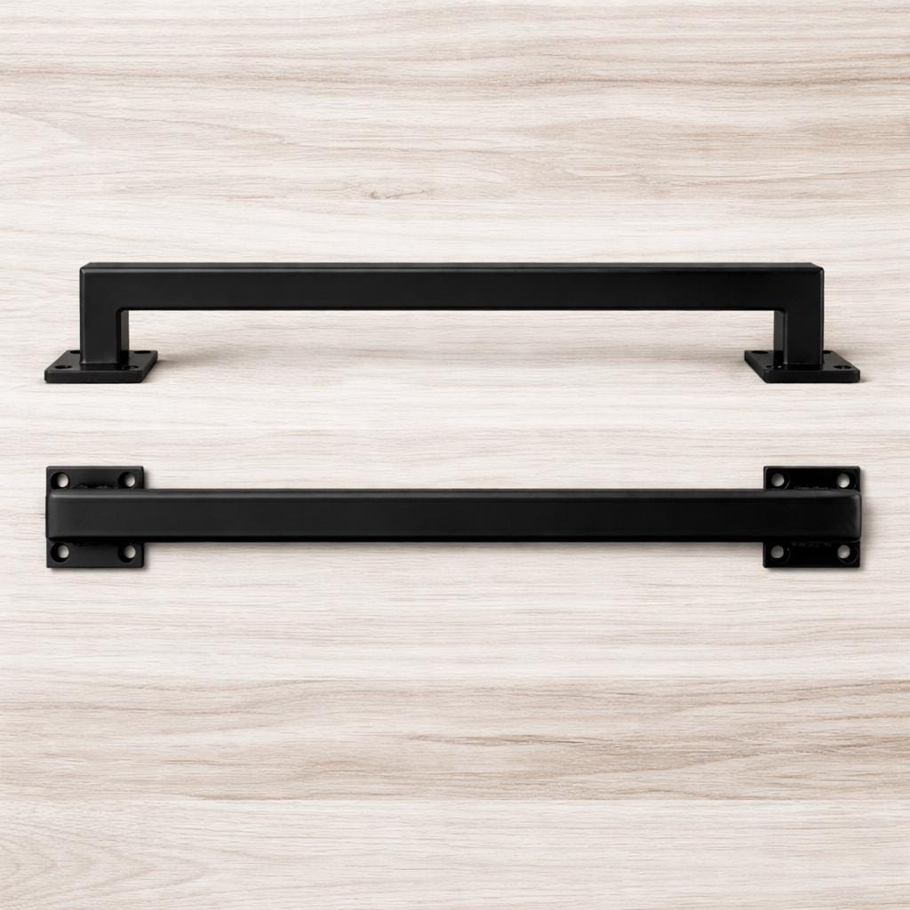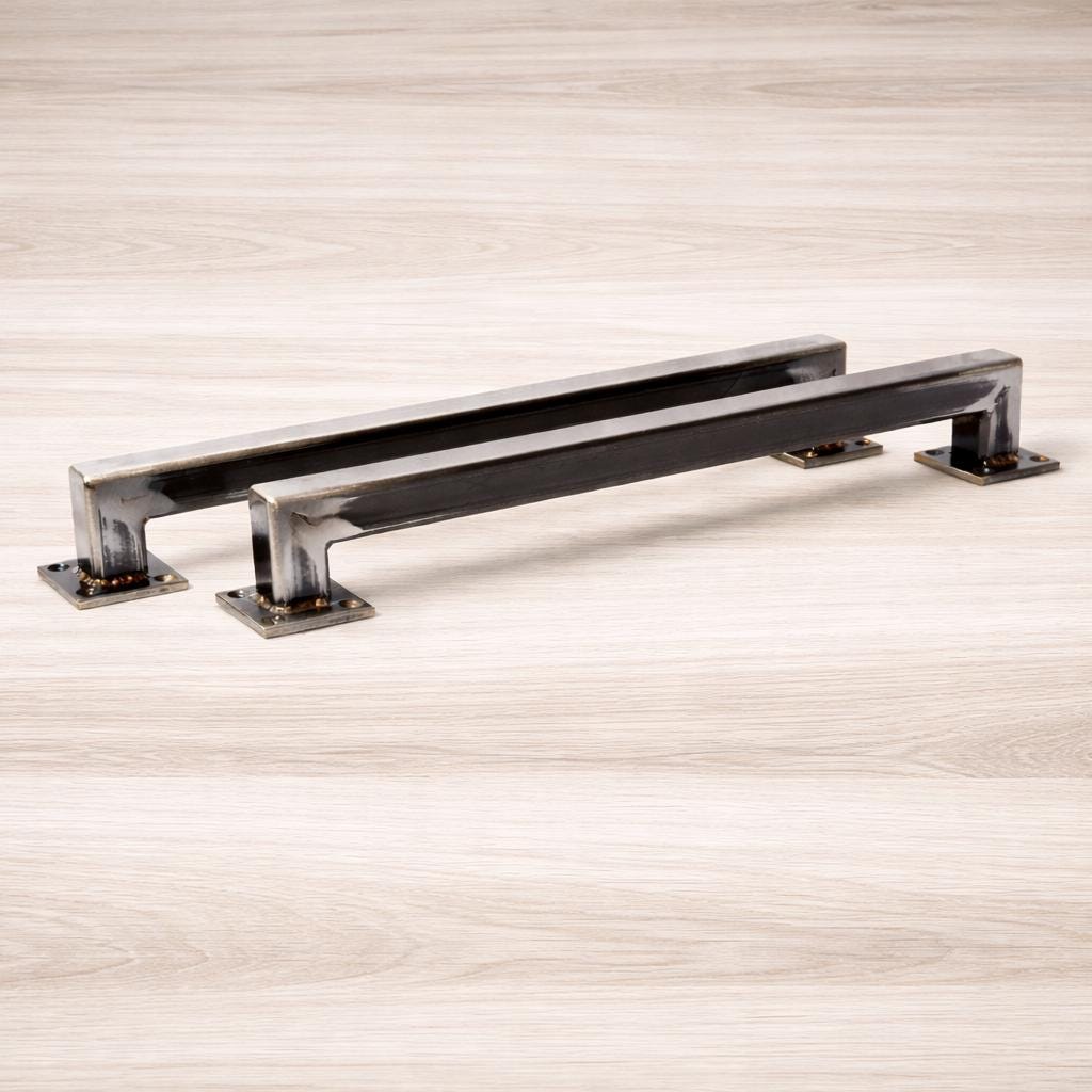 These industrial door handles or drawer pulls are made of 1" 0.100" thick structural grade hot rolled square tube. They are fully TIG welded with stainless filler and ground smooth. 2" square flat mounting plates with 4 holes each - drilled for #12 screws. They will sit 1" from door face, and are finished in a high quality automotive clear coat to protect from rust - if you'd like them to rust, leave me a note with your purchase and I'll leave the clear off.