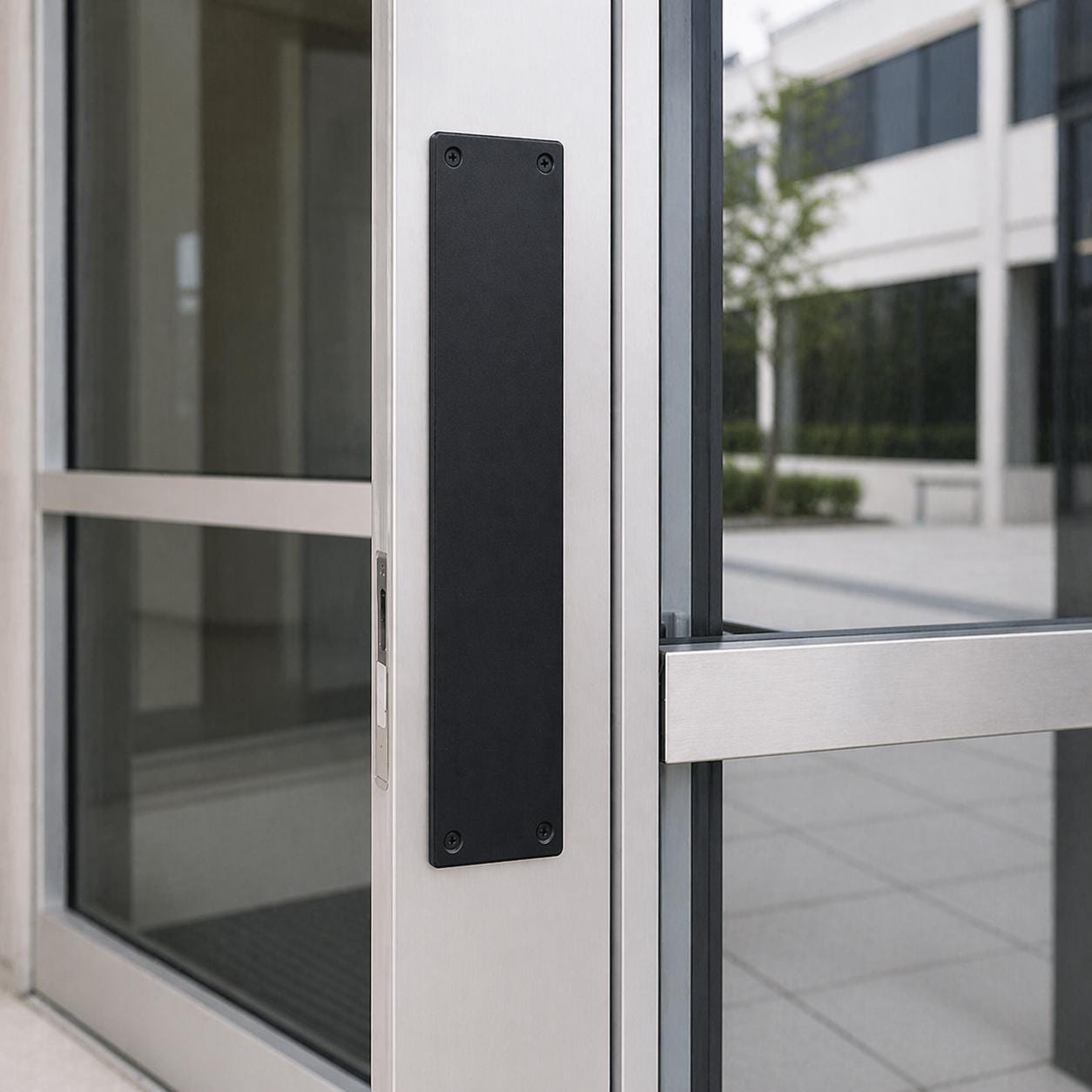 This plate is sized to pair cleanly with modern door pulls and bar handles. It can be matched to handle length for a consistent, architectural layout across the door.