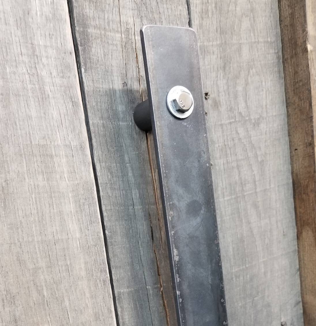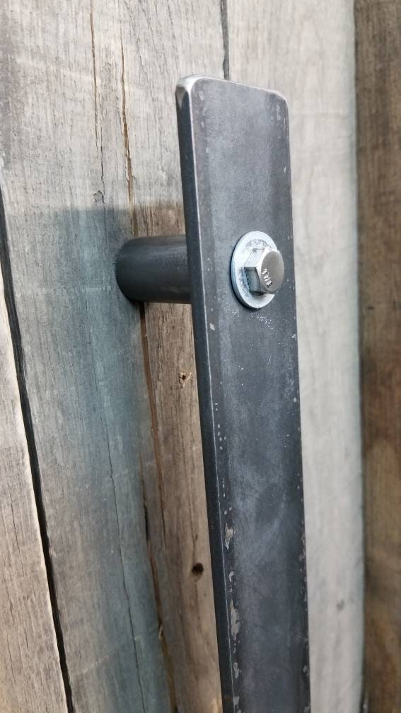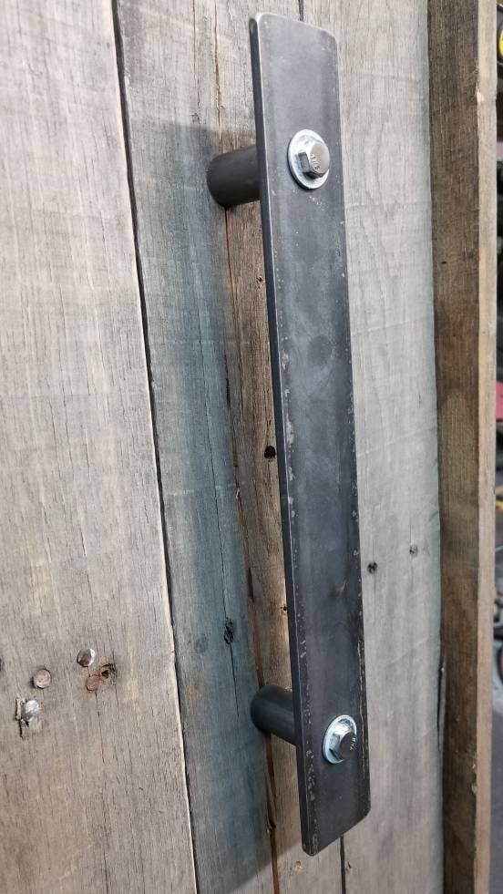 Standard profile industrial barn door handle - measures 1-1/2" wide with 1-1/2" backspacing on 3/4" round posts. Useful as a door or cabinet pull, available in multiple sizes - pictured is a 12" handle.