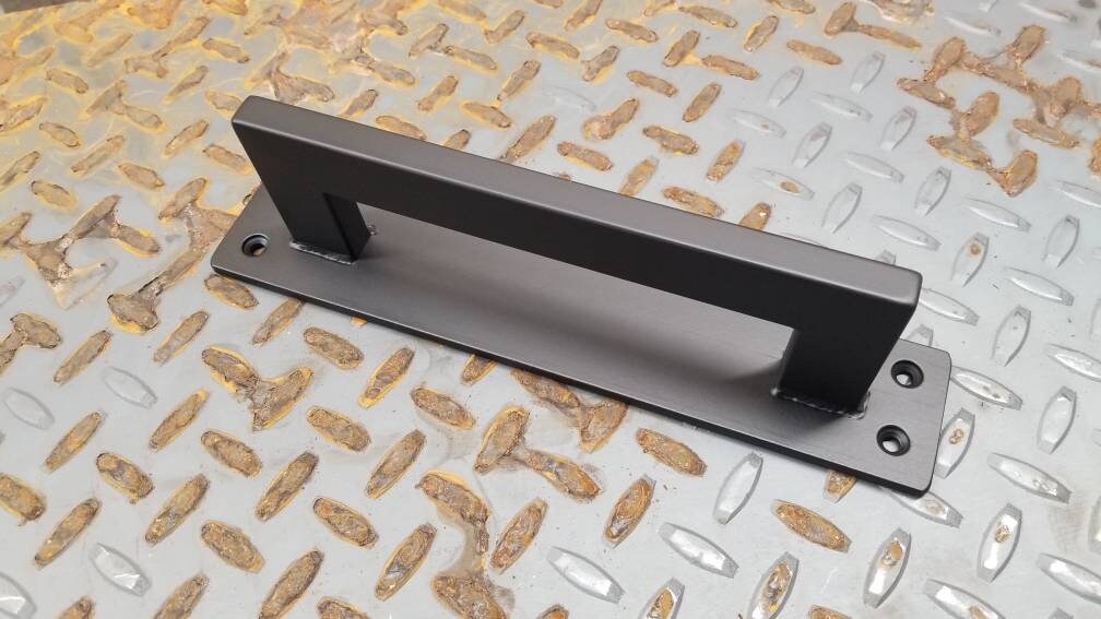 This door handle is made of 1/2" x 1" rectangle steel tube and will stand up to any punishment you could throw at it. The welds are ground clean and smoothed. Once it's finished, the whole piece gets a coat of clear to bring out the natural beauty of the steel. Another option is to paint the handle flat black for a refined, matte finish.