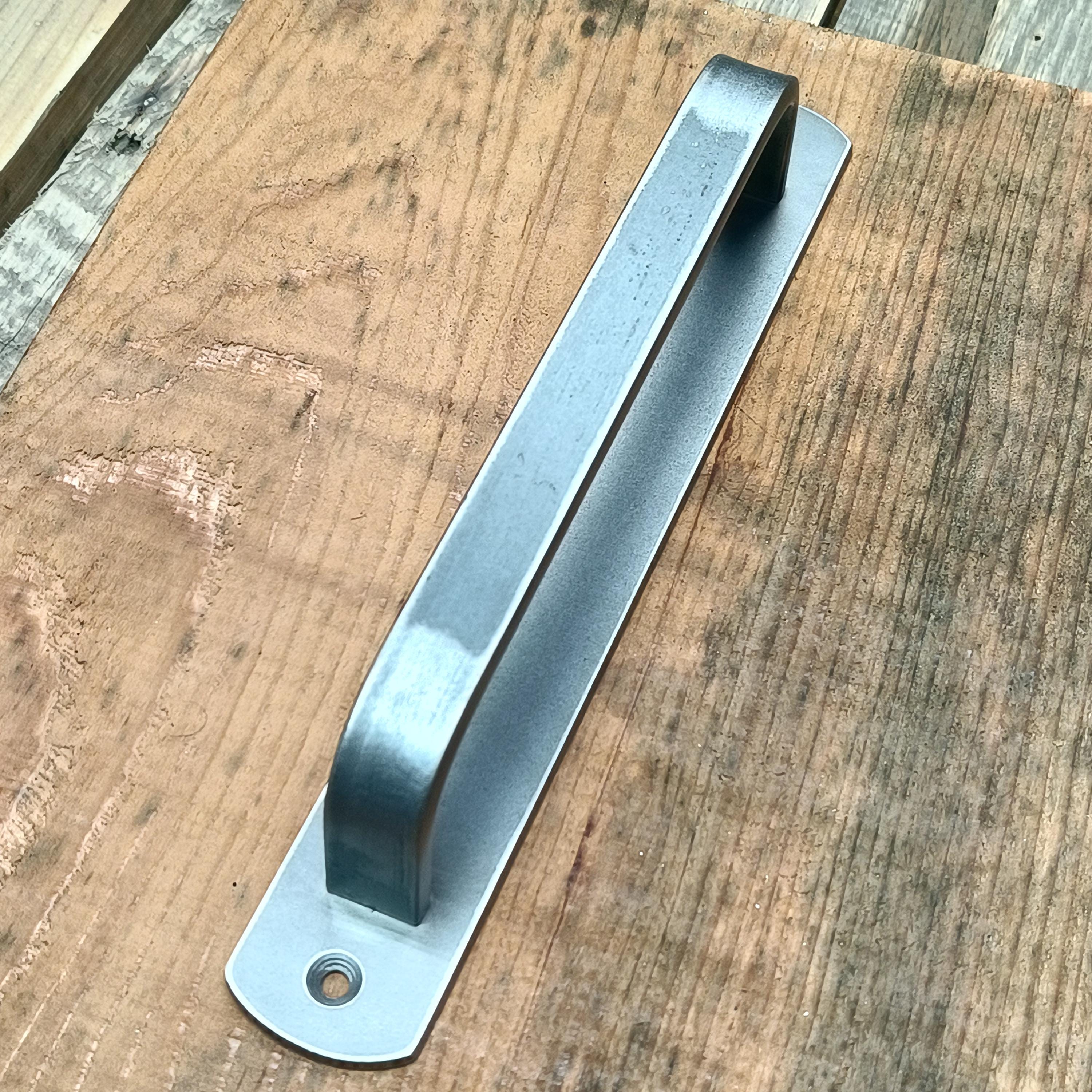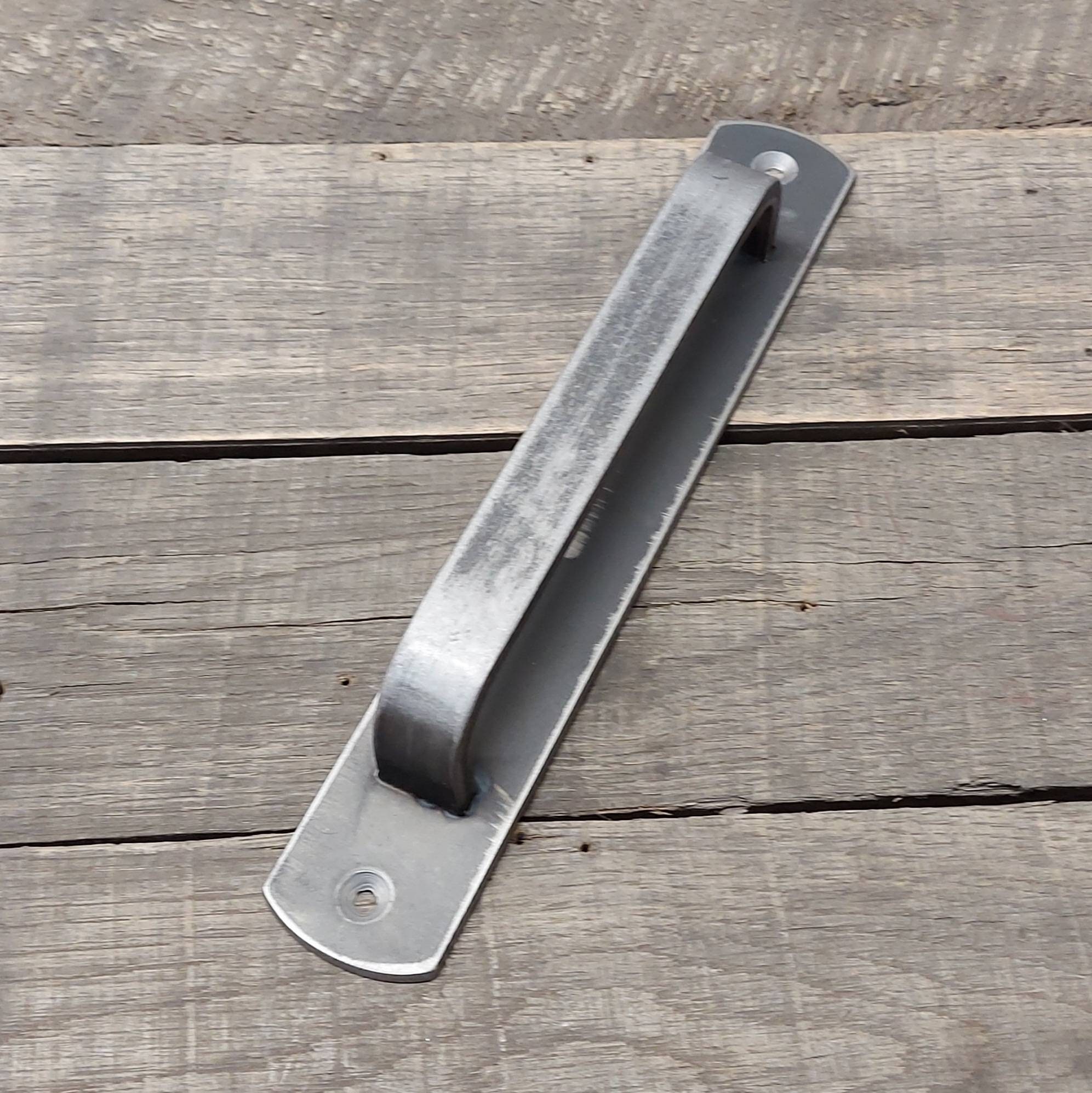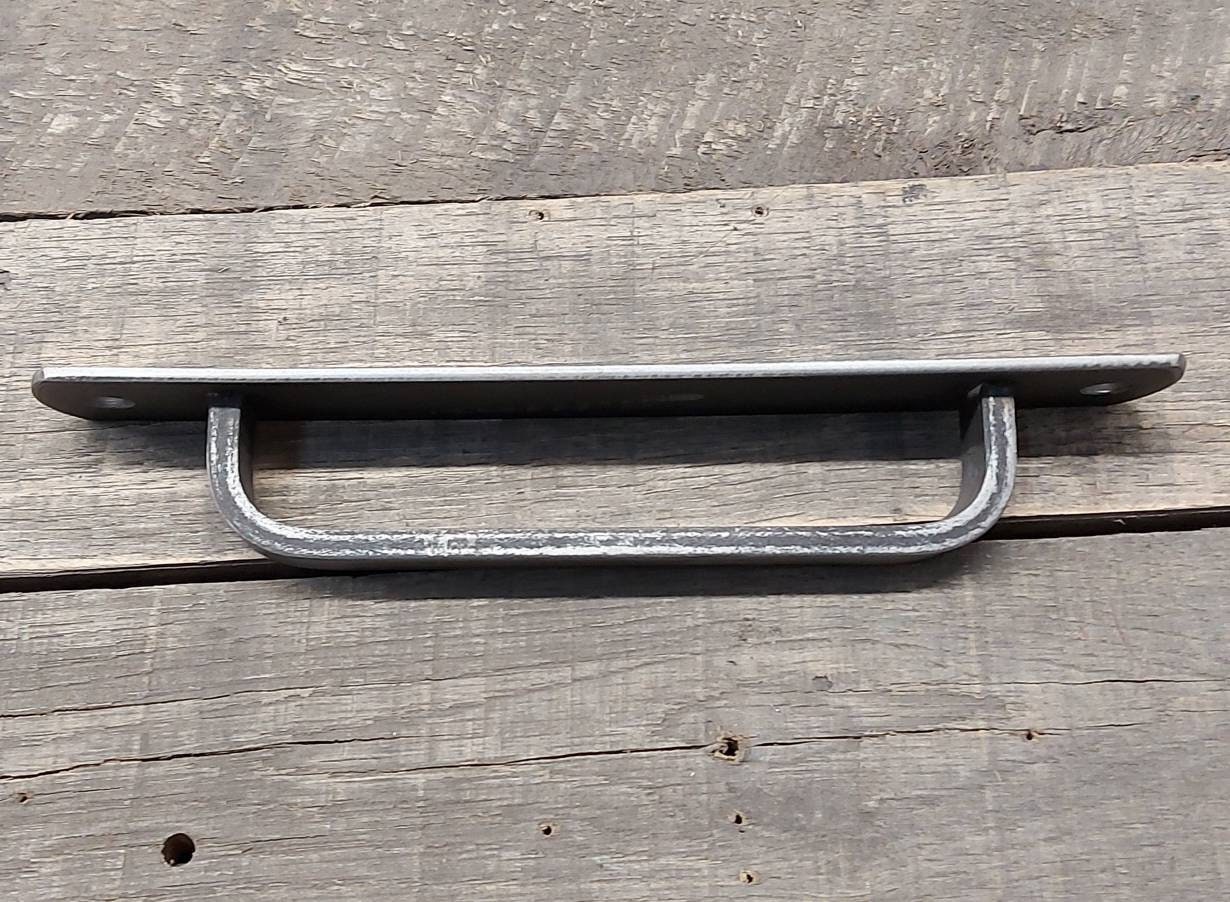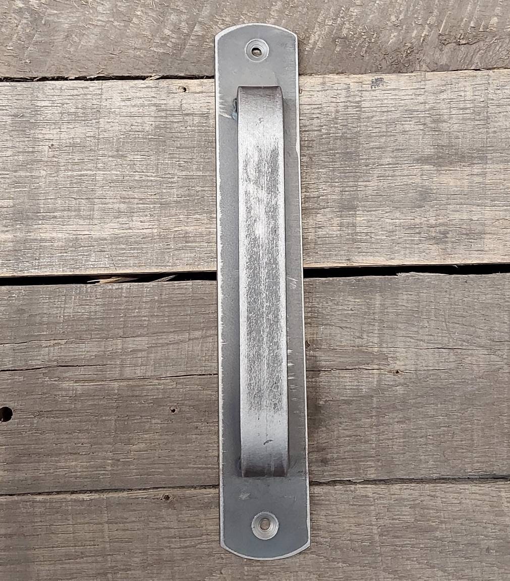 This barn door handle is made plasma cut (in house on our shop-built machine) from 1/8" thick hot rolled steel and 3/4" x 1/4" hot rolled solid bar and will stand up to any punishment you could throw at it.
