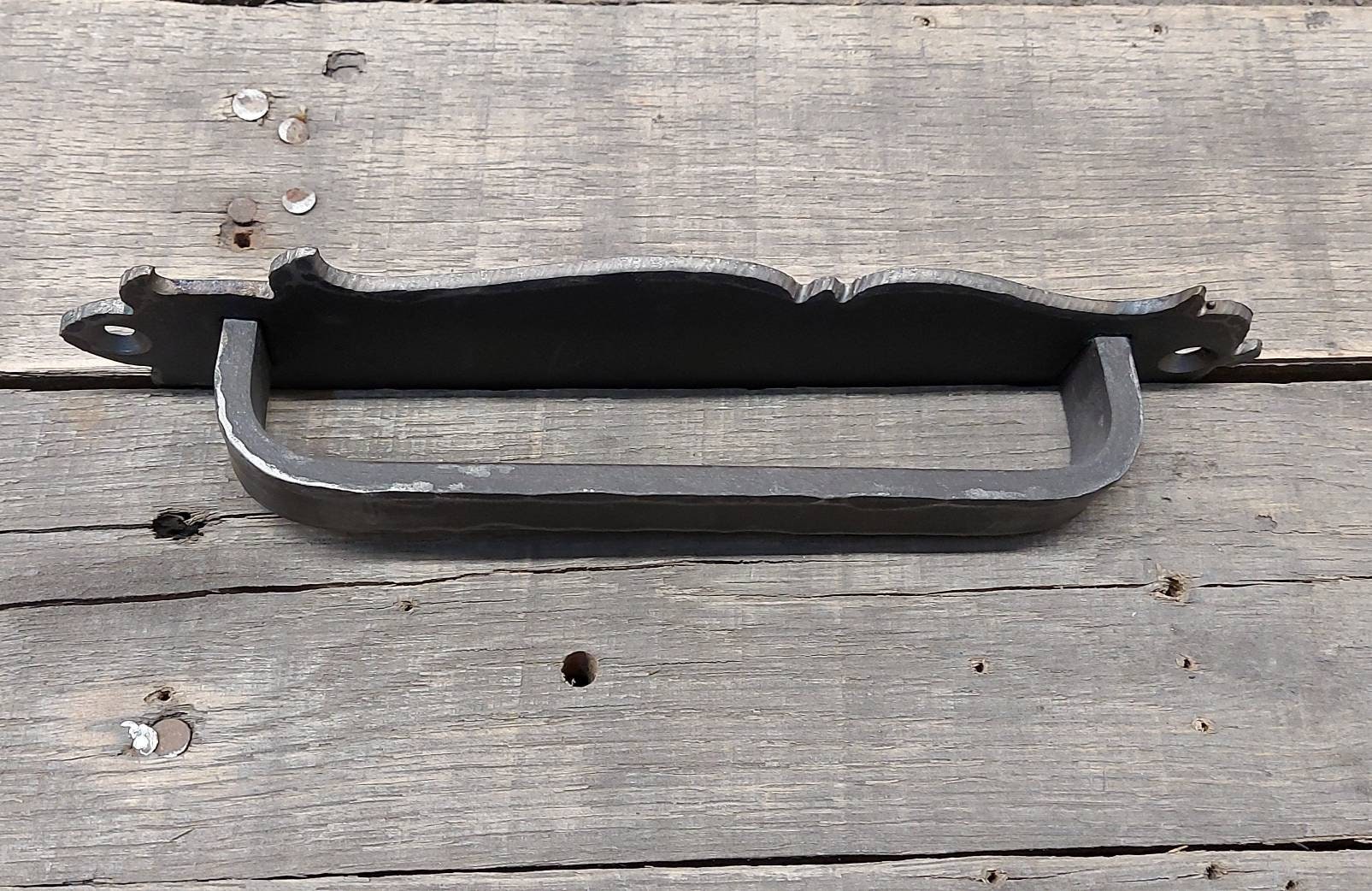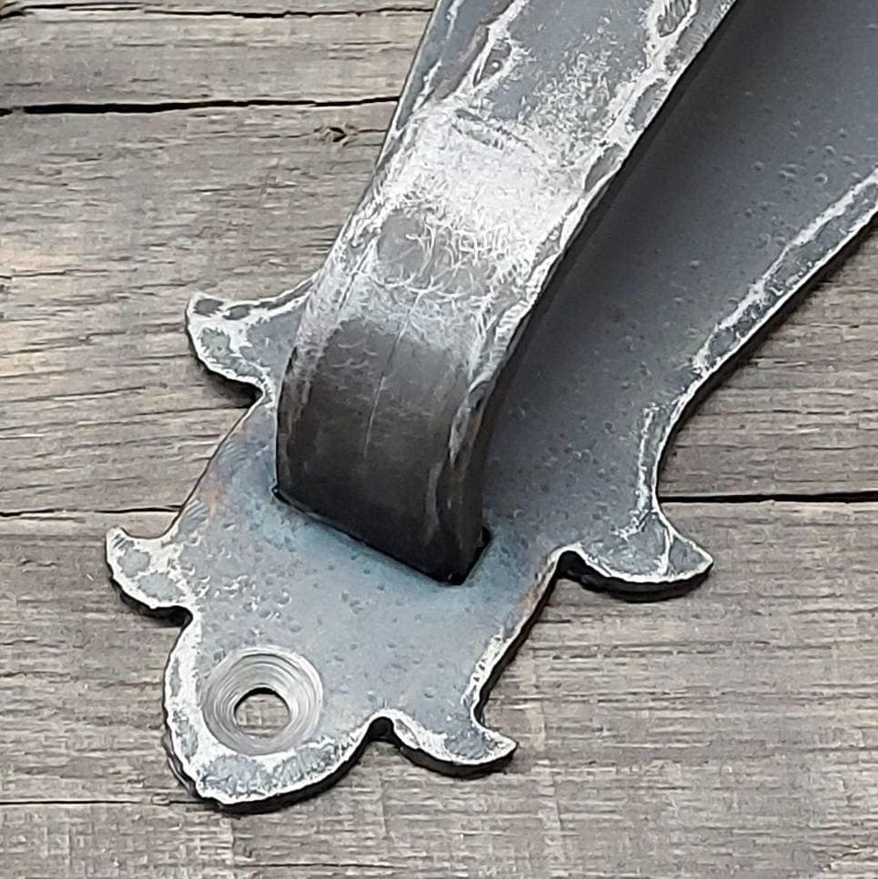 The basic shape is plasma cut on the our in-house (shop built, too!) cutting machine, then hammered to the perfect finish on an anvil. Handle is welded from the back side and is made of 3/4" x 1/4" solid stock, the backing plate is made from 1/8" flat and will stand up to any punishment you can throw at it. 3/16" thick backing is an option for a modest extra cost (message to ask)