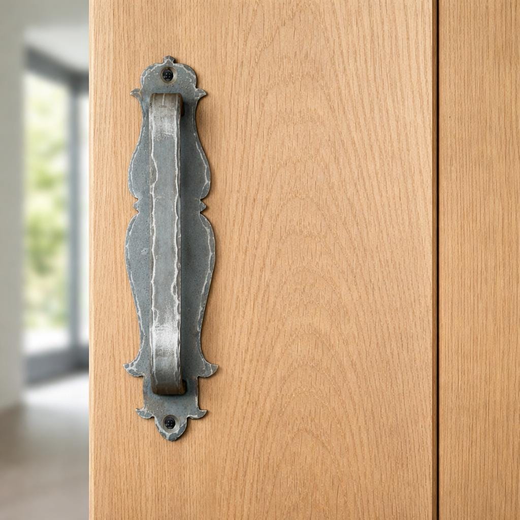 This piece draws from 17th-century rural hardware, where function dictated shape and every curve came from the hand, not a machine. The silhouette is deliberate: softened, slightly irregular, and grounded in weight. It feels less like a product and more like something discovered - as though it has always belonged to the door.